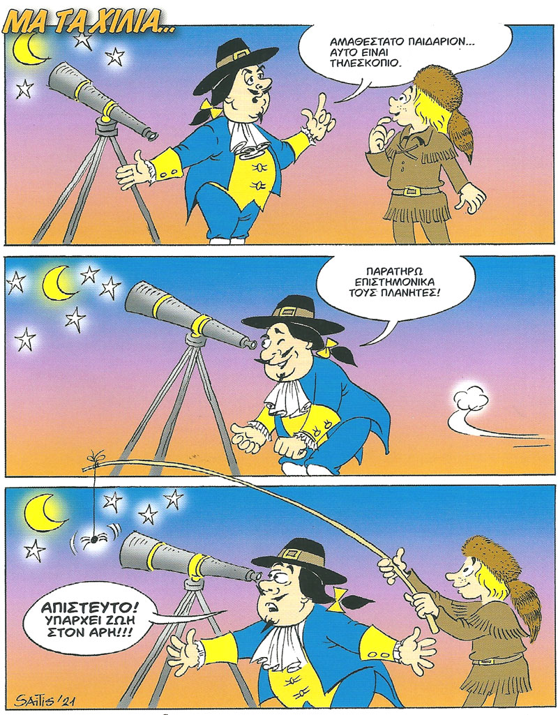 'Life On Mars', comic strip by Vangelis Saitis from Blek magazine (2021). "Oh you, uneducated little child... This is a telescope." "I am scientifically observing the planets." "Unbelievable! There is life on Mars!"