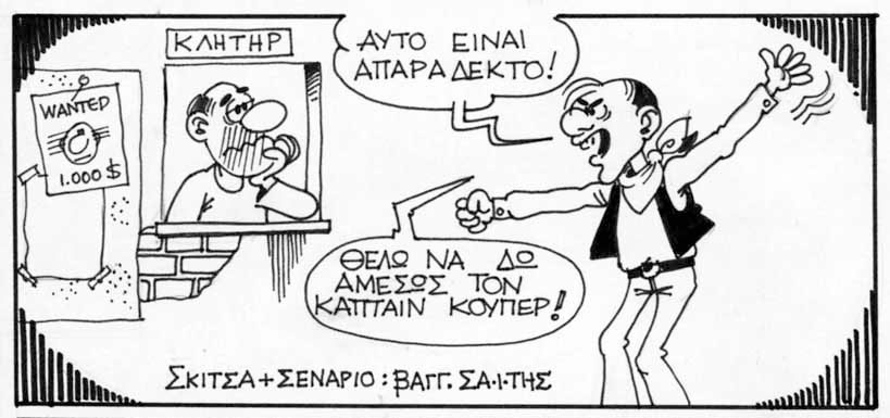 By the early 1980s, Saitis was still working for Mikros Cow-Boy, while also providing artwork to the magazines The Parents and Cosmopolitan. For the short-lived comic weekly Skathari (Σκαθάρι), he created the comic feature 'The Flowers' ('Οι Φλώροι', 1980), about a middle-class family of five. Between 1979 and 1984, other periodicals with his work were the satirical magazines Green Cat, Pontiki and the Greek edition of MAD, as well as the newspapers Vradini, Oikonomotechniki and the weekly New March (Νέα Πορεία). Saitis additionally appeared in the English-language publications, such as Greece's Weekly (1983) and Greece Today (1988).