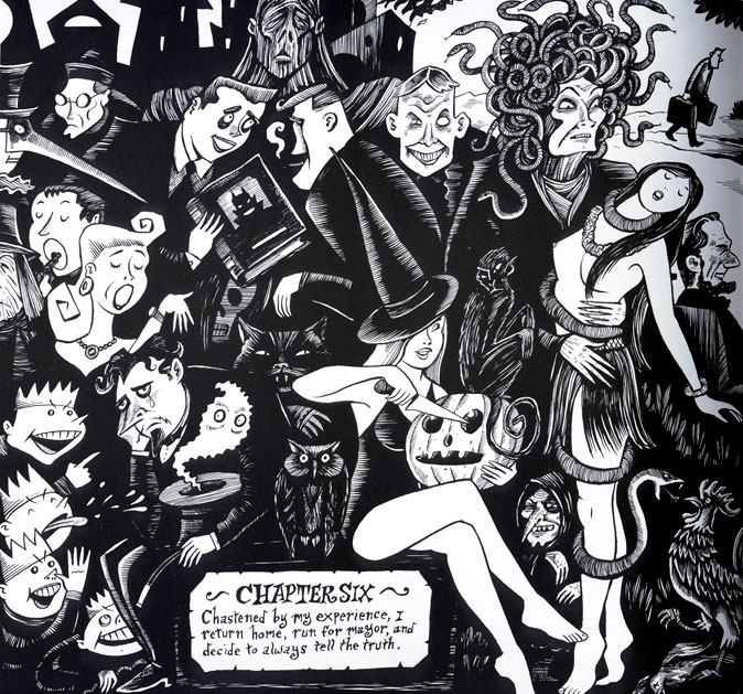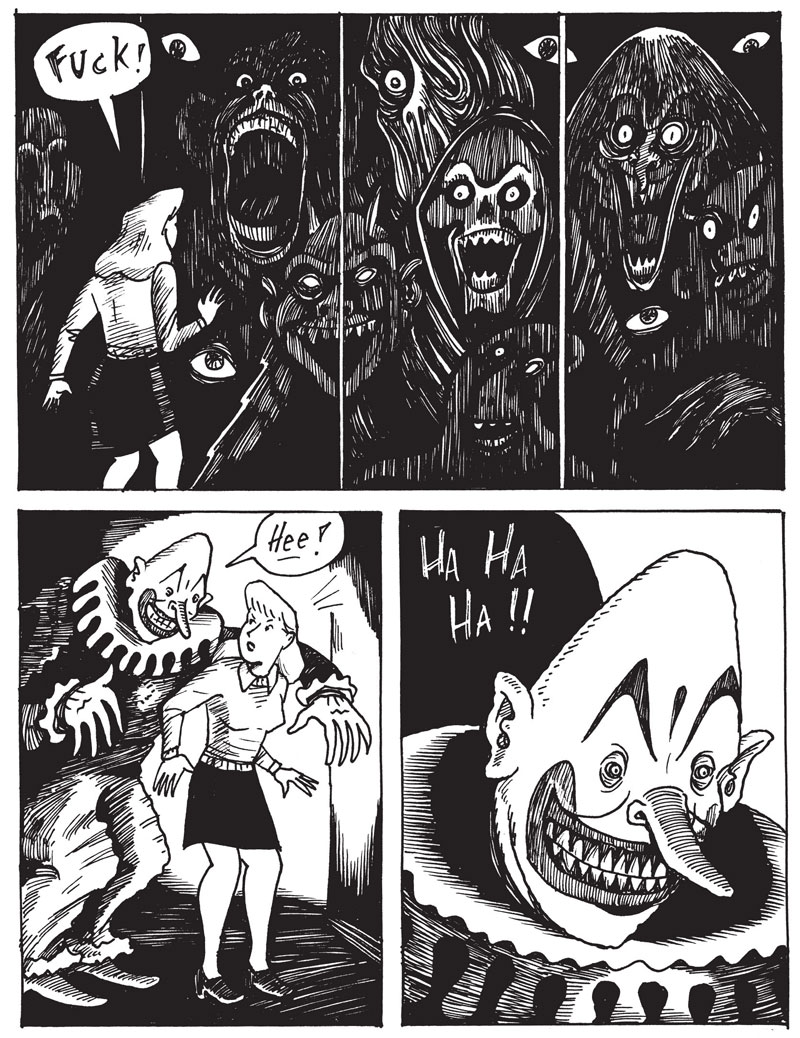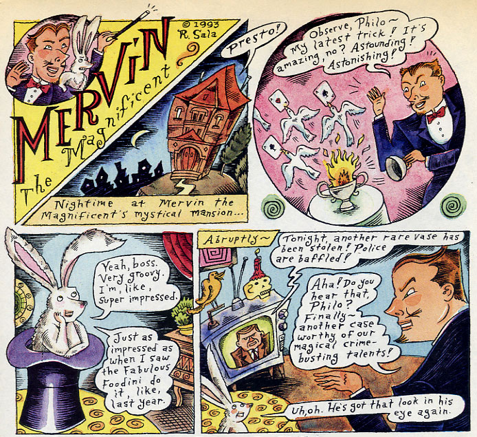 In 1982, Sala opened a painting studio in East Oakland and got a daytime job as an assistant at a university library, while working part-time as an illustrator. His library job provided him with access to many of his favorite novelists and genre books. As it so happened, there was even a large section about occultism and parapsychology. It created a comfortable world for him where he felt very much at ease. His first professional publications could be seen in magazines like the New Times. He was still trying to pursue a career as a fine artist, while reading comics as a pastime. Around this time, he discovered Françoise Mouly and Art Spiegelman's Raw and was completely blown away by it. He especially considered Mark Beyer's 'Dead Stories' a revelation. At that point, he always felt that his weird stories and graphic style wouldn't appeal to anybody, but in Raw he read stuff that was even more far out. The magazine also exhibited a knowledge and appreciation for comics as an artform, which made him realize that the two were perhaps not as incompatible as he once considered. This motivated him to create a full-blown comic book.