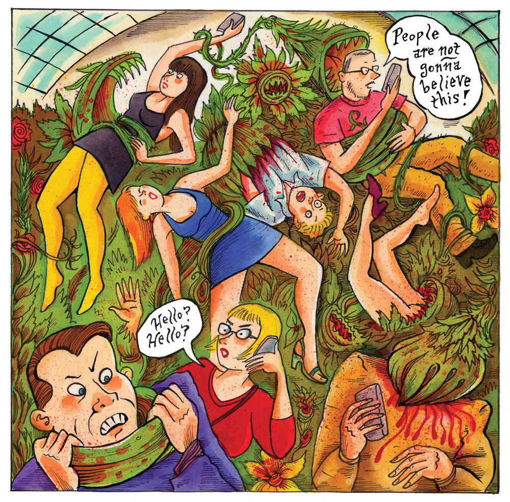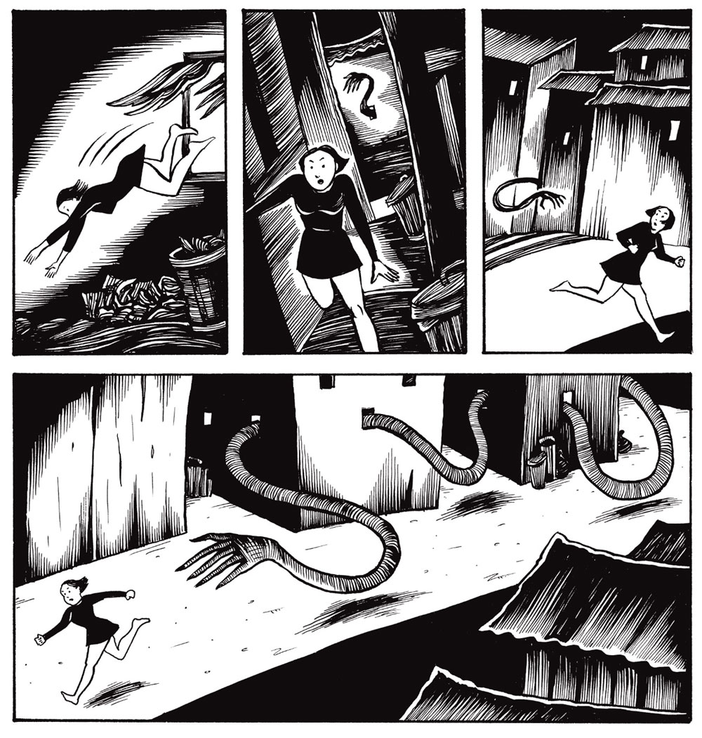 'Violenzia and Other Amusements' (Fantagraphics, 2013) stars a female assassin-for-hire, Violenzia, who combats diabolical cults, hillbillies and other organizations. Swift and efficient, her origins are mysterious, but the blood spattering story has Sala's familiar camp appeal. Despite its title, the book features only two short stories with the main character, namely 'Violenzia' and 'Violenzia Returns'. The other two tales are unrelated narratives. 'The Forgotten' follows a man who travels through a hostile environment with all kinds of nasty creatures lurking in the dark. His journey has lasted so long that he can't remember why he started it so long ago. 'Malevolent Reveries: An Alphabetical Exhibition' is a series of drawings of horrific creatures accompanied by alliterative alphabetical titles.