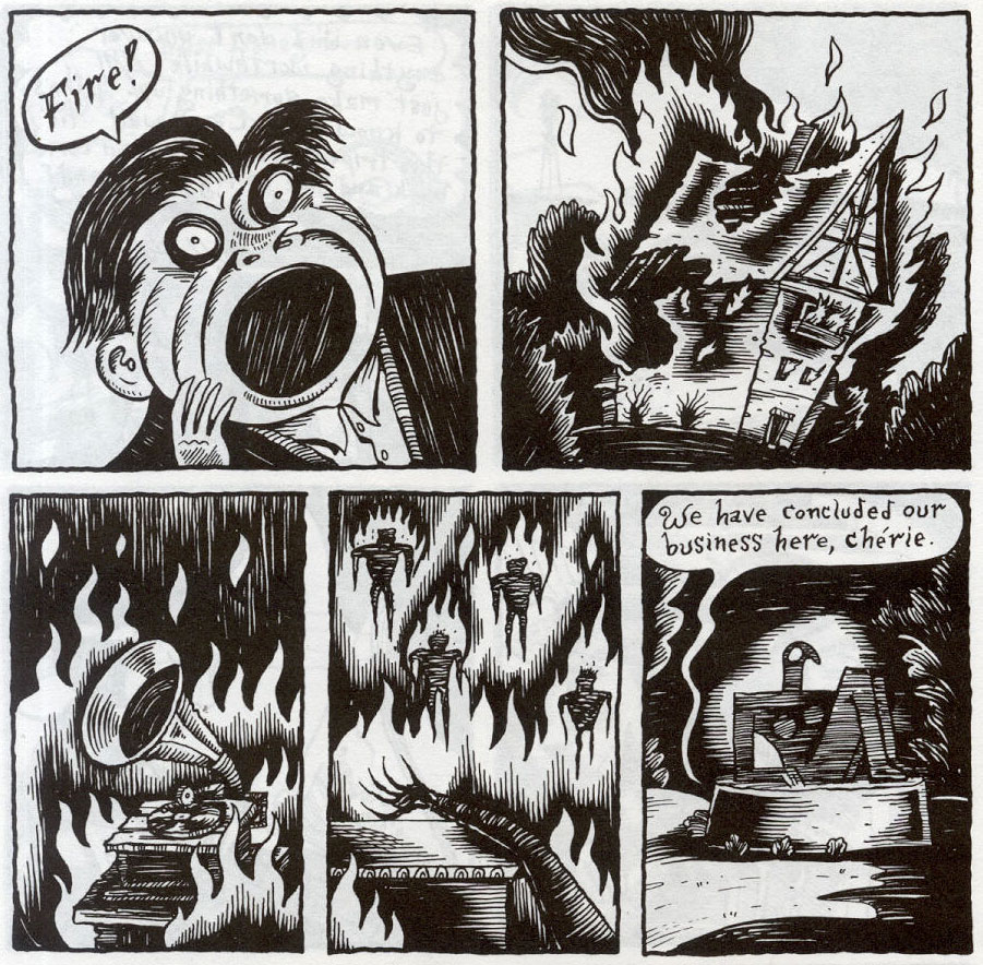 When Sala published comics in Drawn & Quarterly from the second issue in 1990 on, it marked the first time his comics appeared in color. Unfortunately the printing was disastrous. Despite promises that the editors would do something about it, Sala was never satisfied with the final outlook. The only story which somehow came out the way he envisioned it was 'Time Bomb'. For the first time, he felt somewhat in a rut and lost his enthusiasm for comics. He focused on book illustration for a while. His humorous book 'The Ghastly Ones and Other Fiendish Frolics' (Manic D. Press, 1995) was based on the work of William Steig. Sala claimed that he wanted to make something that could be put in the humor sections in bookstores for people outside his niche to discover and enjoy. Yet after a while Sala realized he preferred making comics over illustrating books, because he constantly had to deal with publishers without any artistic background whose criticism was either too vague or too nitpicky.