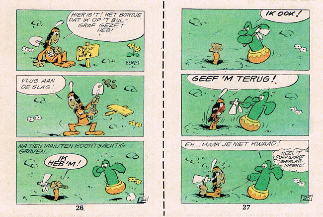 Throughout the 1960s, recurring characters in Salvé's mini books stories with Devos were 'Tim et Tom' (1963-1965), two adventurous brothers crossing the Far West with a rickety wagon, appearing in three episodes. With Deliège, he created five stories with 'Petit-Cactus' (1968-1969), a little Native American camouflaged as a cactus in a flowerpot. For Spirou's regular pages, Salvérius and Devos created the gag series 'Whamoka et Whikilowat' (1963-1967), another feature about two Native Americans. Both men were big fans of the Far West, and the initial solo episodes with the Sioux warrior Whamoka were filled with educational fun facts, accompanied by funny artwork. When the funny papoose Whikilowat joined the cast, the concept turned into largely pantomime gags. From scripts by the future crime novelist G.J. Gavazzi, Salvé made three short stories starring 'Ginarino le Sicilien', about the adventures of the inhabitants of the Sicilian village of Fiodaliso.