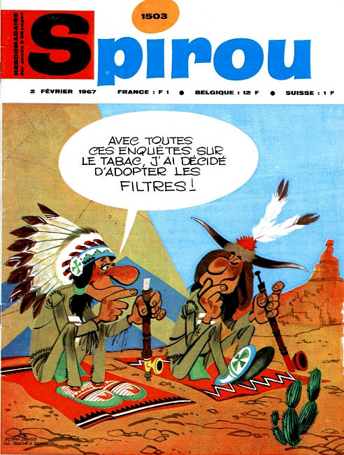 Cover of Spirou #1503 starring Whamoka and Whikilowat by Louis Salvérius (2 February 1967). Translation: "After all those studies on tobacco, I've decided to switch to filter."