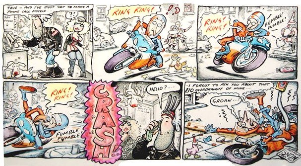 Sample was one of several cartoonists to make a contribution to 'Spitting Image. The Giant Komic Book' (Pyramid Book Ltd & Octopus Publishing Group, 1988), a comic book based on the satirical puppet TV show 'Spitting Image' by Peter Fluck and Roger Law.
