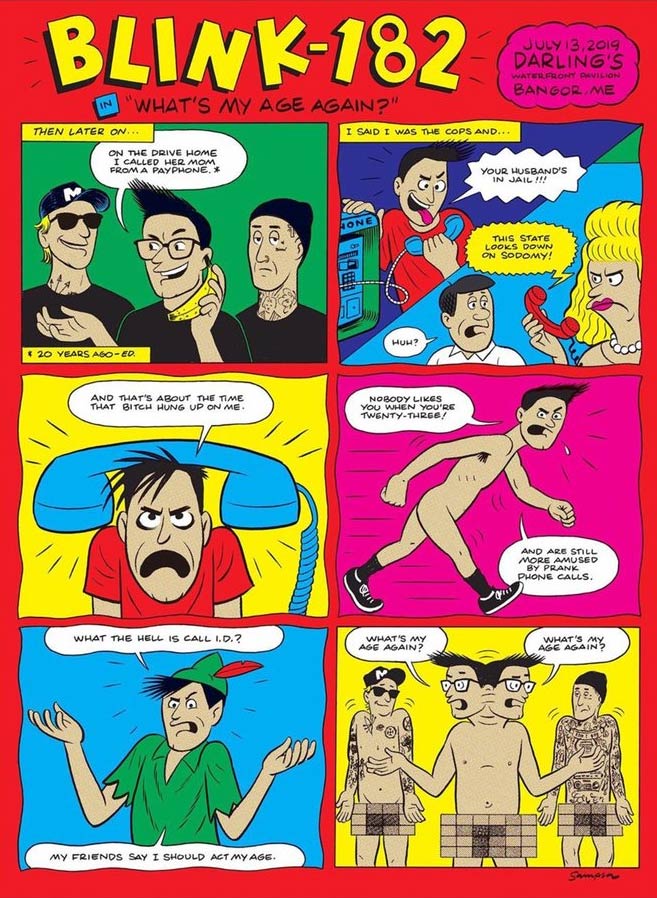 Sampson has designed concert posters for musical acts like The Black Keys, Benjamin Gibbard, Mick Jenkins and the Yonder Mountain String Band. His poster for the 13 July 2019 Blink-182 concert at Darling's Waterfront Pavillion in Bangor, Maine, is notable for its comic strip style. Sampson also used the comic format for his greeting card/poster 'Chicago, A Love Story': in twelve consecutive panels the city is portrayed as a horrible place. A citizen endures various hardships, though still sighs in the final panel he "loves this fuckin' place."