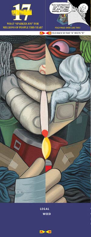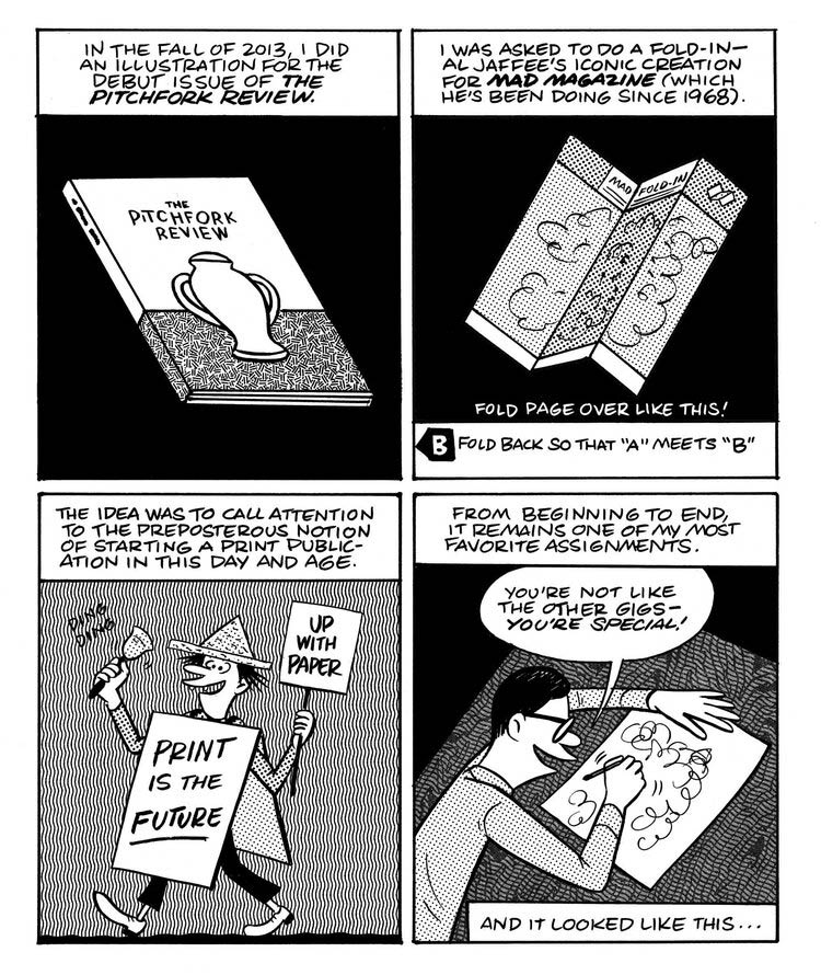 Even though Sampson worked in a cartoony style and sometimes used comic strip-like panels in his commercial assignments, he never considered making comics. He felt it was a field too difficult to make a living in. In 2013, he changed his mind, when Pitchfork Media launched the Pitchfork Review, a magazine aiming to prove that printed media still had a chance in today's digital world. The editors asked Sampson to create a parody of a Mad Magazine fold-in: a page of which the left and right side have to be folded, so one can find the "hidden message". They were a tradition in Mad since 1964, when creator Al Jaffee introduced the feature. Sampson sent his fold-in not only to Pitchfork, but also to Al Jaffee, accompanied by a fan letter.