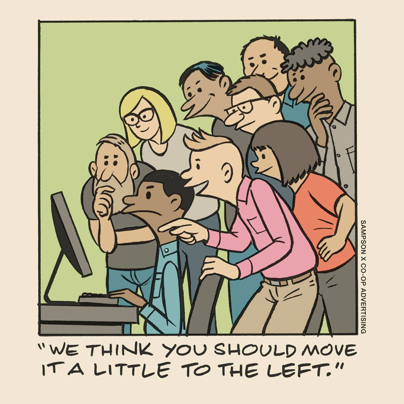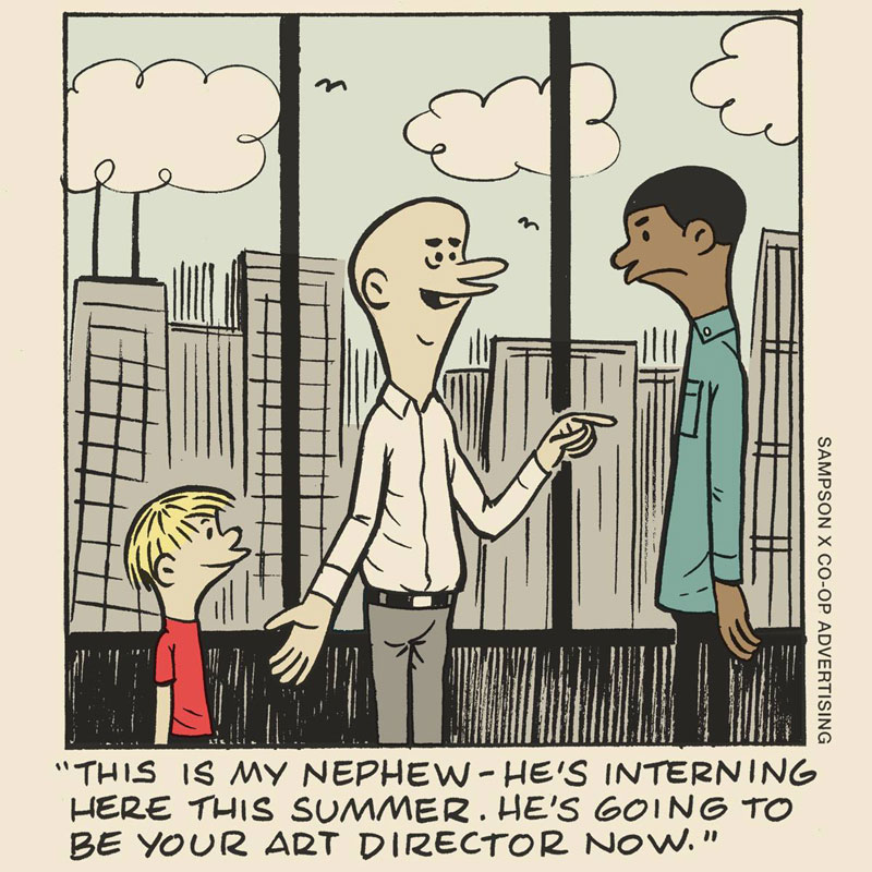 On 14 April 2017, Sampson and Co-Op Advertising launched 'Creative Diff'rences with "Lance"' - often shortened to 'Lance'. In this one-panel cartoon series, a young black creative artist named Lance endures weekly disappointments. His work is constantly rejected, belittled and underestimated. Even when he manages to get an assignment, he falls victim to executive meddling or exhaustive tasks barely worth the effort. Lance works long, lonely hours to reach his deadlines. He has to tolerate people who fancy themselves experts and who take credit for everything. People often insist - even expect - that he does everything for free. His work is shared online, where he can't sue for copyright infringement. The poor freelance artist undergoes all these ordeals with a permanent sad/irritated facial expression. These tragicomical situations are painfully but hilariously recognizable situations to any freelance creator, and Sampson's cartoons have often gone viral on social media platforms. The series is published by LANCE, a freelance platform based in Toronto, Canada.