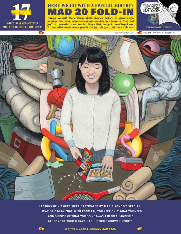 Starting in issue #542 (December 2016), Sampson's first cartoons appeared in Mad's letter department, 'The Fundalini Pages', which in 2018 was renamed to the 'Shorts and Briefs' section. After several one-shot comics and illustrated articles, Sampson had the honor of being the first artist, other than Jaffee, to illustrate the famous series 'Snappy Answers to Stupid Questions'. His first entry ran in the October 2019 issue under the title 'Snappy Internet Comments to Honest Questions', written by Matt Cohen. In the August 2020 issue, he illustrated 'Snappy Answers to Existential Questions', scripted by Desmond Devlin. In June 2020, the 99-year old Jaffee retired. Mad published a special tribute issue, which, apart from Jaffee's final fold-in, featured homages by fellow cartoonists. Sampson too made a tribute fold-in, which appeared online rather than in the magazine. It wasn't until the October 2020 issue when Sampson's first official fold-in saw print in Mad's pages. Contrary to his predecessor, Sampson makes extensive use of digital tools like Photoshop, but otherwise the concept has remained unaltered and the style Jaffee-esque. Since then, each new Mad issue has featured a fold-in written and drawn by Johnny Sampson.