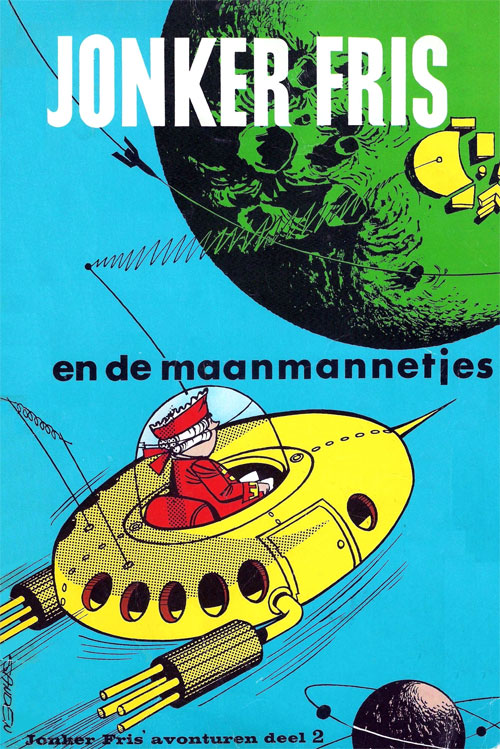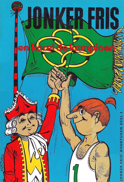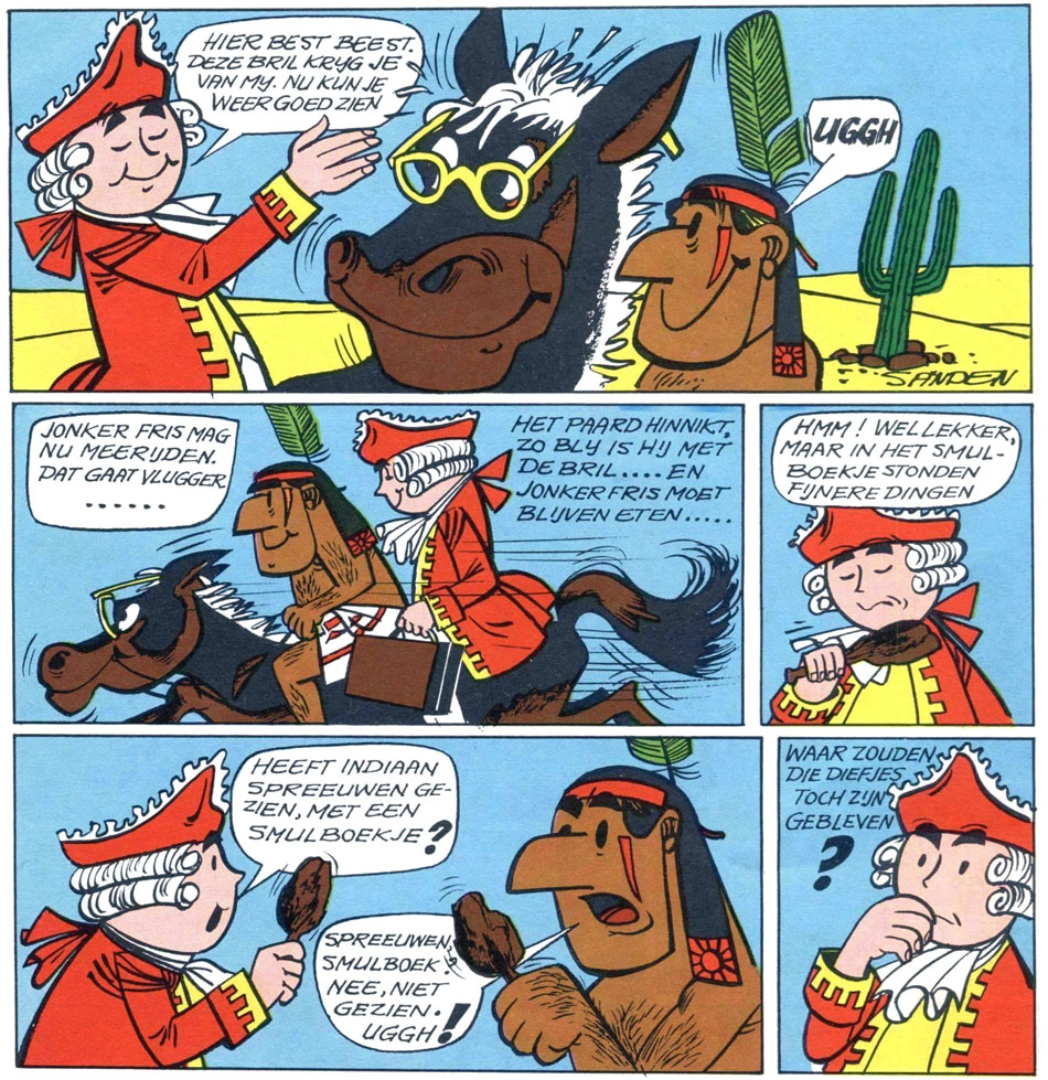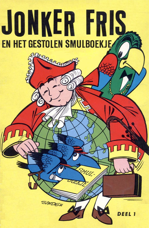 The three 'Jonker Fris' comics were lavishly signed by Sanden, and presented the adventures of the company mascot and his animal menagerie. In the first issue, 'Jonker Fris en het Gestolen Smulboekje' ("Nobleman Fresh and the Stolen Feast Booklet"), the nobleman's recipe for strawberry jam is stolen by two smoking starlings, and the ensuing recovery mission brings him around the world, encountering a whale, a giant, a native tribe and other exotic characters. In 'Jonker Fris en de Maanmannetjes' ("Nobleman Fresh and the Little Moon Men") - the second booklet - Jonker Fris gets the moon people interested in his canned foods. The third and final installment - 'Jonker Fris en Karel de Kampioen' ("Nobleman Fresh and Charles the Champion") had the nobleman organize a sports event.
