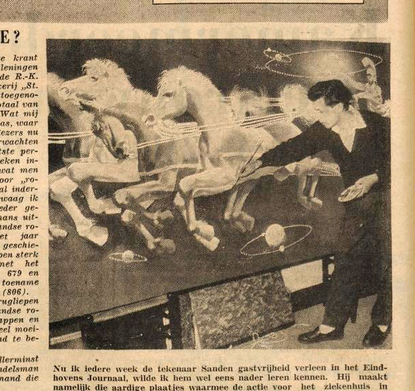 By the time of the November 1960 article, Sander was also trying his hand at filmmaking - he had just completed a short about knights - mixing live action with cartoon art. His cameraman was called Piet van Hout, also from Eindhoven. The trigger for the Eindhovens Dagblad article was Sanden's attempt at submitting a script to a West-Berlin movie company. It is not known if his German adventure ever took off. Under the name "Maurice Sanden", the artist was mentioned in the 15 October 1960 issue of Eindhovens Dagblad with regard to an exposition in the "Kunst- en Antiekcentrum Schevelingen" in the town Aarle-Rixtel. His exposition consisted of paintings, drawings and "little jokes". The paper praised Sanden for his "ingenuity and decorative feel", described his large paintings as surreal and deemed his cartoons "pleasant", but "with a predictable pattern."