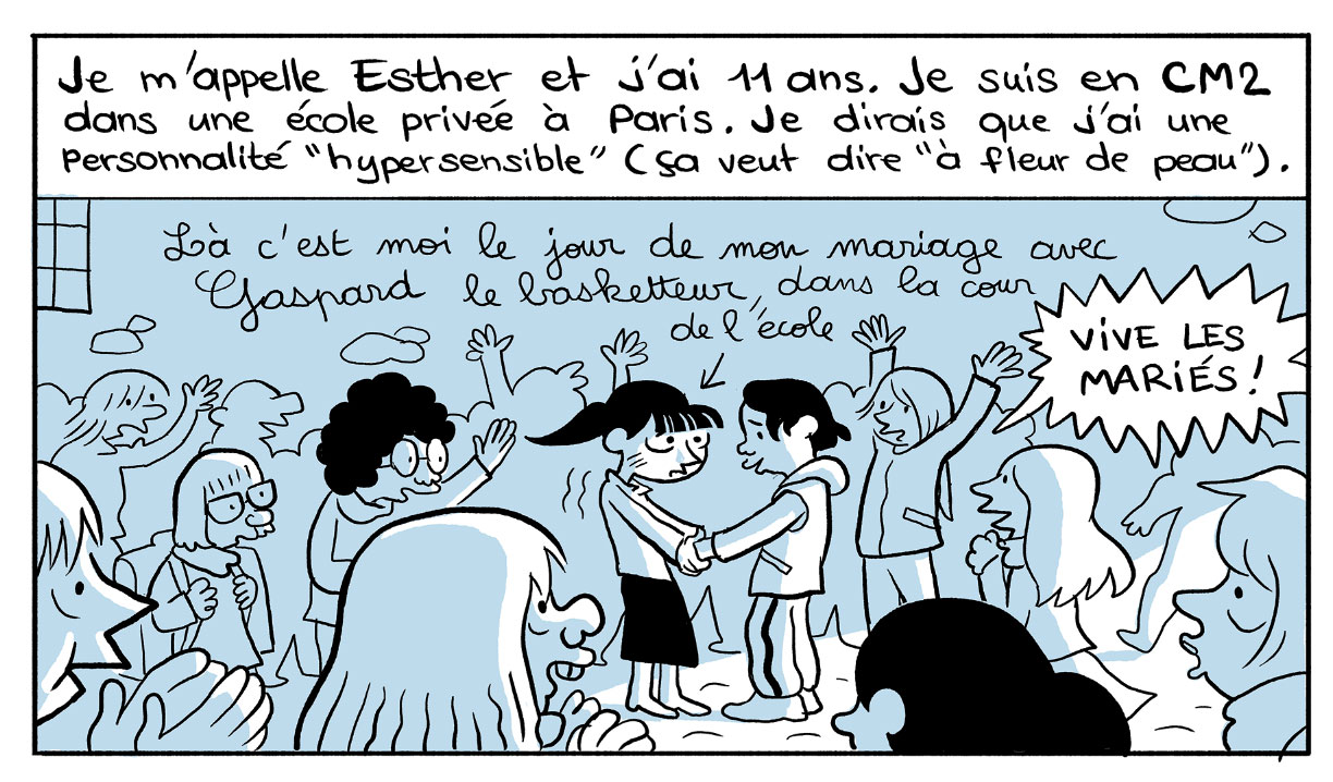 In 2014, Raid Sattouf left Charlie-Hebdo and moved over to the weekly magazine Le Nouvel Obs with his new feature 'Les Cahiers d'Esther' ("Esther's notebooks"). The comic chronicles the true stories told to him by the nine-year old Esther A. Ongoing, the feature follows the girl as she grows older. Since 2016, Allary Éditions has released book collections.