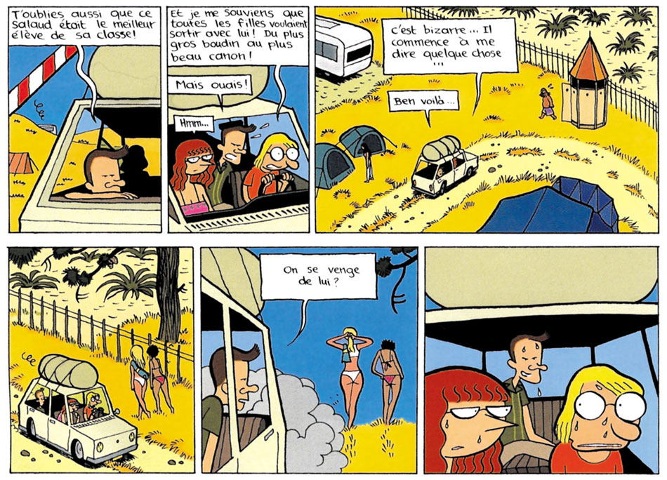 Because of the foul language and the negative portrayal of his father in his two Bréal Jeunesse books, a couple of conservative Catholic organizations filed a complaint against Sattouf for obscenity, and he was questioned by the police. This prompted Charlie-Hebdo journalist Stéphane Bou to request Sattouf for a graphic report about the experience. After that, he was asked to join the team of this satirical magazine, even though his work was not political. Instead, Sattouf launched his weekly page 'La Vie Secrète des Jeunes' ("The Secret Life of Youngsters", 2004-2014), in which he captured his direct observations of youngsters on the streets. The results were tragi-comical, faithfully representing the youth's language, suburban accents and behavior. Sattouf provided his weekly page over a period of ten years, with the final episode appearing in the summer of 2014. Publisher L'Association released three book collections between 2007 and 2012. In the same tradition, Riad Sattouf spent a couple of days at a Parisian school for well-off children, and compared his observations to his own traumatizing high school experiences. Changing names and faces, he turned his research into the graphic novel 'Retour au Collège', in which he gave an honest portrayal of the comings and goings of teenagers from upscale neighborhoods.