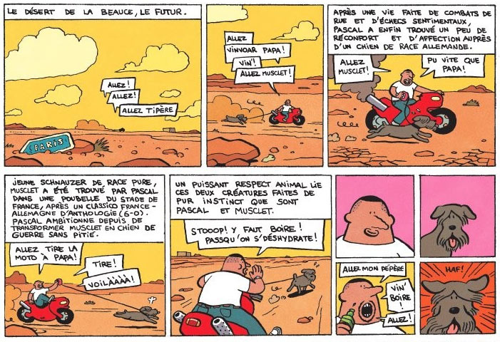 Riad Sattouf's best-known fiction work is the comical 'Pascal Brutal' feature (2005-2018), which appeared in the humor comic magazine Fluide Glacial. The setting is a dystopian France, where a wave of ultra-liberalism has absurdly modified the French territory into several autonomous regions, and where access to the center of Paris has become forbidden to the poor. Titular character Pascal Brutal is the pinnacle of virility: dominant, macho and hypersexual. In his adventures, this virility is either illustrated or undermined. In the same observational style of his other comics, Sattouf based the character of Pascal Brutal on the type of beefy, self-confident males he encountered in his daily life. Éditions Audie released four book collections. In the last one, Sattouf dropped the character's original context and constantly placed him in completely different situations, making him a stand-up comedian, dramatic actor, a fortuitous heir in the world of food distribution or a football star.
