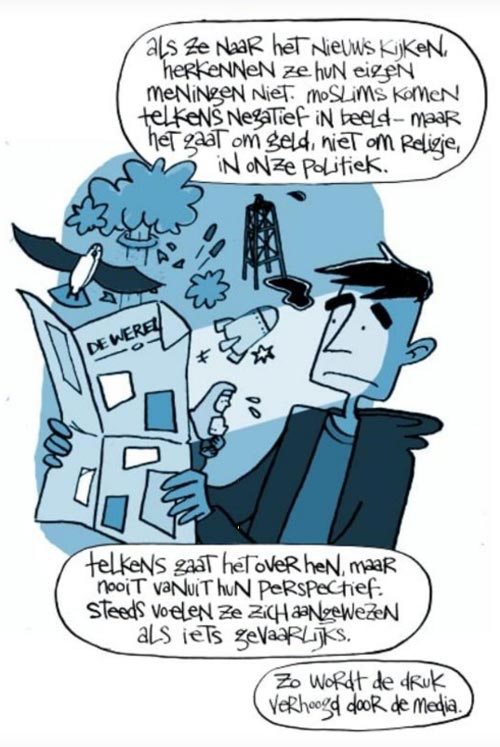 Since 2016, Stijn Schenk has definitely made his mark in the field of graphic journalism with his In Lijn Foundation. He gathers artists from varying comics disciplines and lets them draw comics about subjects with a major social impact. Among them have been sexual abuse, domestic violence, mental and physical health and human rights. Schenk grouped his humanitarian comics projects under the imprint The Graphic Story, later rebranded to Real Comics. With his project, Stijn Schenk has initiated a valuable new utilization of comics art in the Netherlands. Several early stories were published on the online youth platform Mindshakes, which included art by Aimée de Jongh, Amanda Majoor, André Slob, Anne Staal, Elmer de Gruyl, Emanuel Wiemands, Frederik van den Stock, Jan Willem Spakman, Joris Diks, Karida van Broekhoven, Kenny Rubenis, Kim Duchateau, Manon Bijkerk, Martijn van Santen, Mas Hab, Mei-li Nieuwland, Merel Barends, Pieter van Tongeren, Shamisa Debroey and Tom van der Linden.