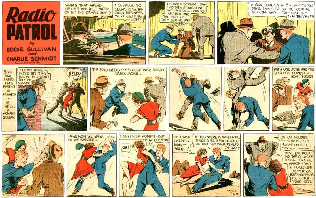 'Pinkerton, Jr.' quickly caught on and from 1934 on received a more nationwide distribution after being picked up by King Features Syndicate. At this occasion, it was retitled 'Radio Patrol', after the characters' radio patrol car: at the time a brand-new invention. Later it was renamed again to 'Sergeant Pat of Radio Patrol', despite the fact that Pat always worked in a team. The Sunday strip was added on 25 November 1934, and ended on 20 October 1946. The daily strip ran until 16 December 1950. Between May and June 1935, a Sunday topper called 'Public Enemies Through the Ages' appeared, featuring background information about notorious criminals in previous centuries, told in comic strip format.