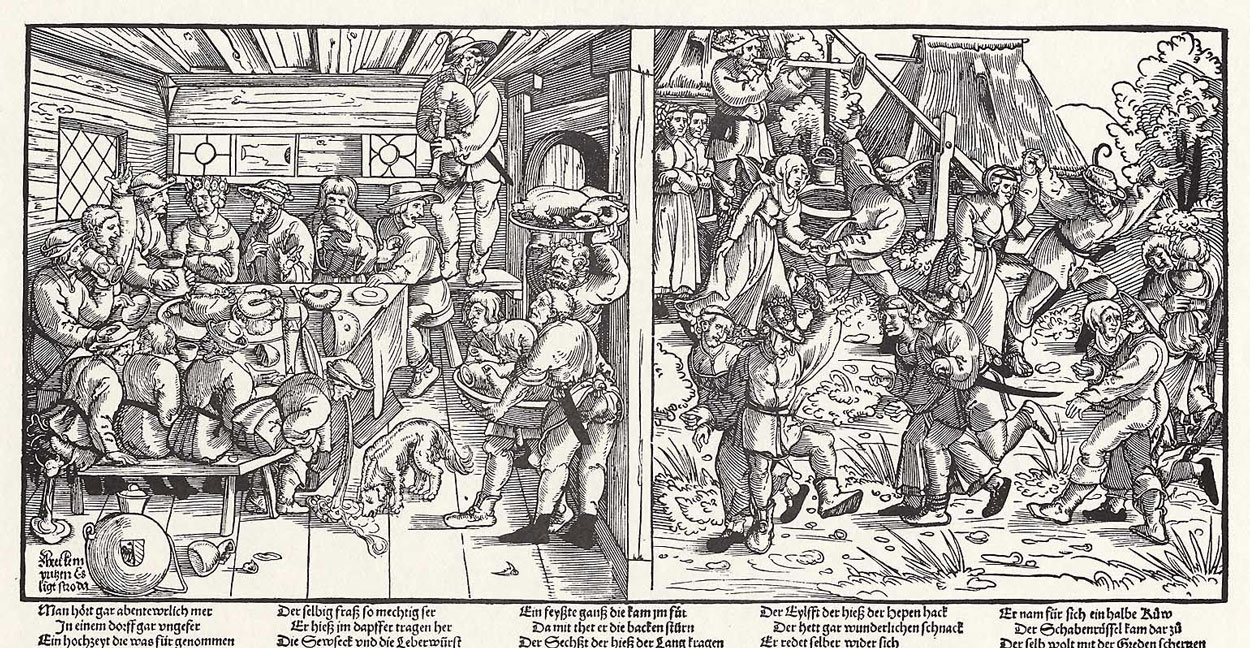 In addition, Schön made illustrated narrative sequences with clearly separated images. 'Bauernhochzeit' ("Peasant Wedding", 1526) is still a bit ambiguous in this field. It portrays farmers eating and drinking in a tavern, while others enjoy a dance outside. The tavern door is positioned in such a way that the scenes inside and outside can be interpreted as one image or two different ones. Either the inside and outside activities take place at the same time, or they should be viewed as a "before and after" scene. Schön continued the party themes with 'Vier Eigenschaften des Weines' ("Four Features of Wine", 1528). The illustration shows four different outcomes of heavy wine drinking. The table guests in the upper left corner are jolly, while the ones on the right get aggressive and start fighting. In the lower left corner the drinkers are so sick that they throw up. At the lower right, the light-headed drunks act outright silly. 'Four Features of Wine' is not a real "story" in the sense that there is no transition from one scene to another. It is also not clear whether the people depicted in these four different images are intended to be the same characters. Yet the illustration does show four alternative endings to a hypothetical question about the effects of wine consumption. In that sense, it can be considered at least part of a narrative.