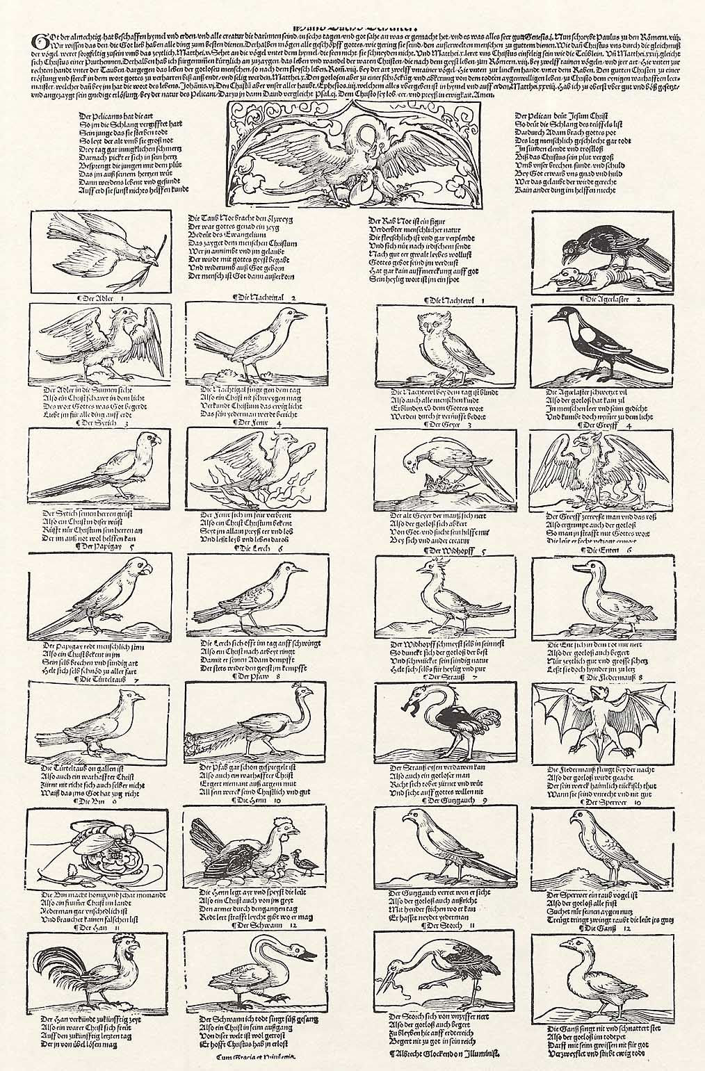 The strangest prototypical comic strip by Schön might be 'Reine und unreine Vögel' (1534). It offers an overview of all birds that are "pure" or "impure". Schön visualizes each bird in a small drawing, with a description underneath. The "good" ones are shown on the left, like the nightingale, parrot, dove, peacock, chicken and the swan. The "bad" ones, including owls, crows, magpies, ducks, storks and sparrowhawks, are depicted on the right. His criteria are based on biblical associations and otherwise unrelated folk legends and popular animal stereotypes. The very idea of categorizing birds based on their supposed character traits is nowadays laughable. But since this classification was made centuries before ornithology became a science, some of Schön's assumptions are even more ludicrous. Some animals he describes as "birds" may indeed have wings, but aren't actually related to avifauna, like the bee ("good side") and the bat ("bad side"). Of other flying creatures he portrayed we now know that they don't even exist, such as the phoenix ("good side") and the griffin ("bad side").