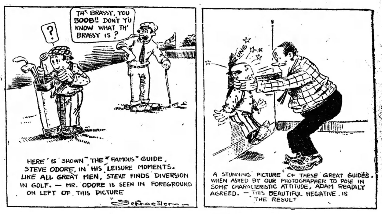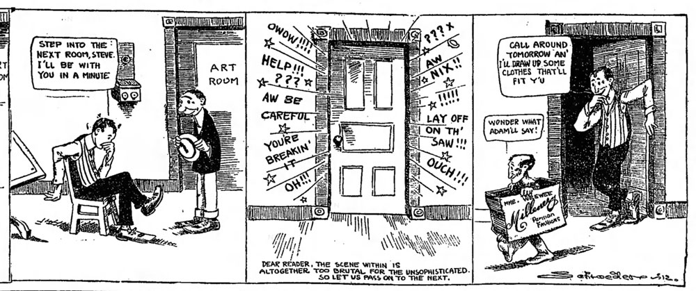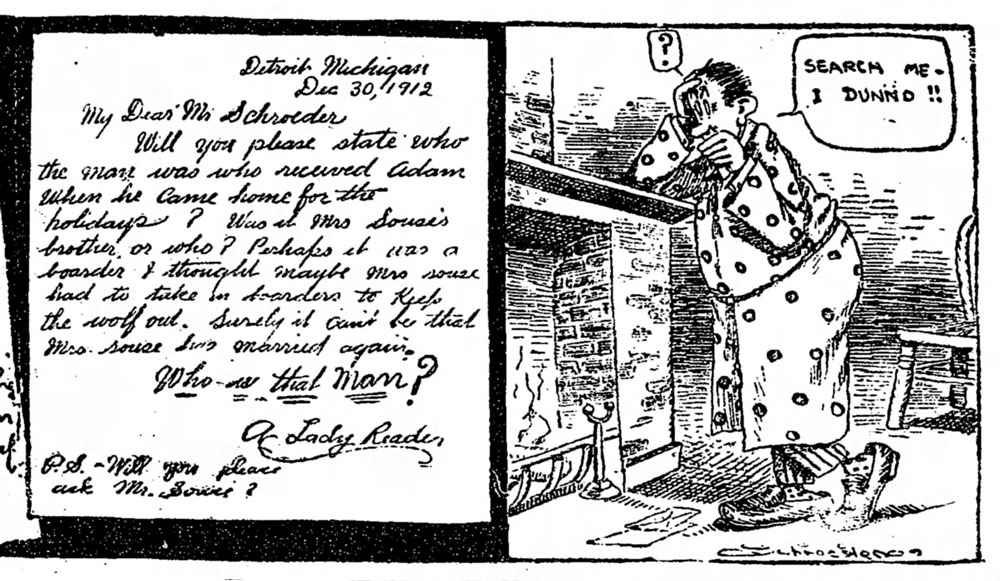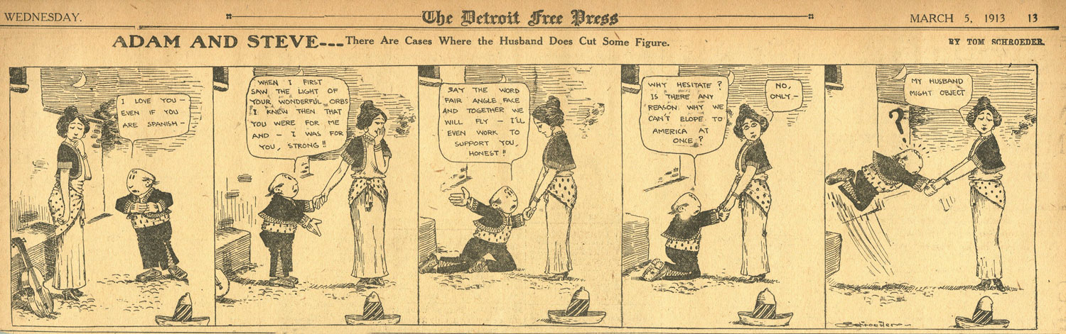 On 7 April 1912, Schroeder's strip 'Adam and Steve' debuted in The Detroit Free Press. The two "Detroiters" Adam Souse and Steve Odore starred in several offbeat and weird strips until 26 October 1914. In some episodes, they appear to be friends and live together, in other episodes, they play tricks on each other, resulting in one of the two, usually Steve, getting knocked down. Much of the humor presumably referred to local news or customs, making the jokes difficult to understand for modern-day readers. The characters seem to be aware that they are in a comic strip, though. In one of the early episodes (14 April 1912), Adam calls the cartoonist with the request to make Steve smaller. The artist then summons his character and saws him shorter. From then on, Steve indeed remains the shorter of the two. The 3 January 1913 strip features reproductions of letters from readers to the cartoonist, requesting to know how an unresolved storyline continued, during which Adam returned home to his family and found another man in the house. The final panel has Adam pondering next to a fireplace, mumbling "Search me... I dunno!".