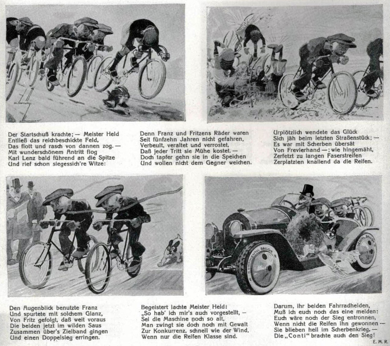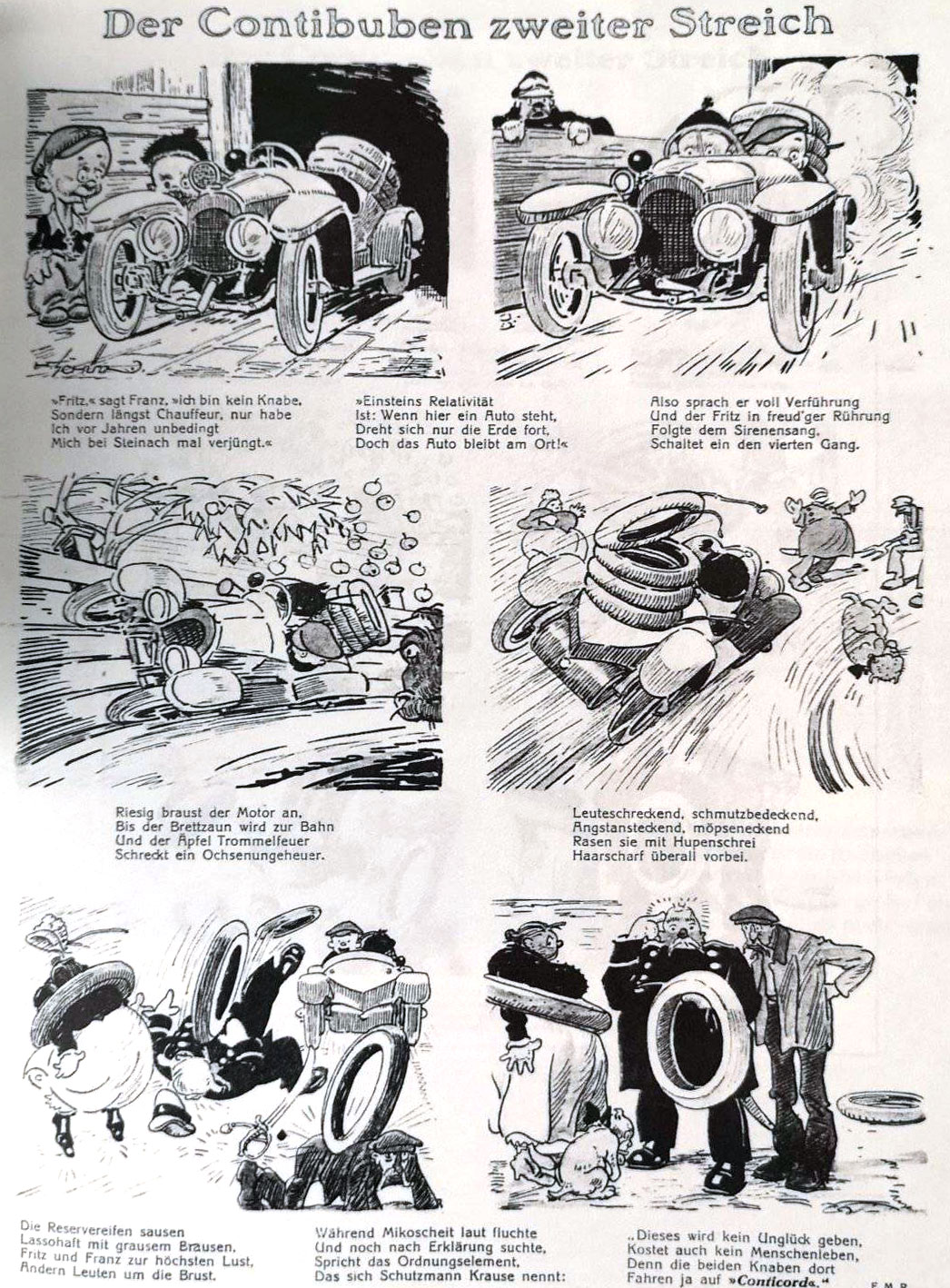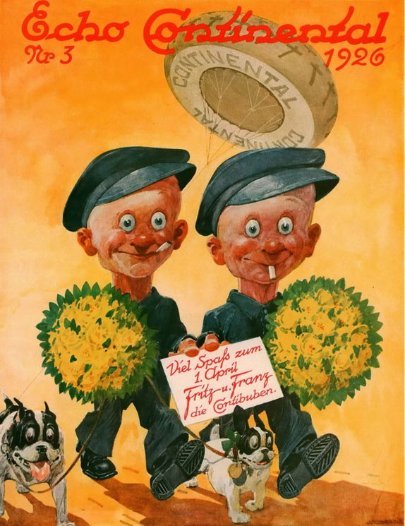 In 1923, chief editor Erich Maria Remarque created a comic strip for Echo Continental, scripted by him under the pseudonym EMR, and drawn by Schütz: 'Der Contibuben' (1923-1926). The titular characters Fritz und Franz are pranksters in the same tradition of Wilhelm Busch's scoundrels 'Max und Moritz' and Rudolph Dirks' 'Der Katzenjammer Kids'. Like 'Max und Moritz' and most comics from this era, 'Der Contibuben' was a text comic, with rhyming couplets underneath the images. Interestingly enough, Fritz and Franz are depicted as identical twins, which might hint at Schütz taking inspiration from his own childhood. The comic characters also have two dogs, Flock and Karo.