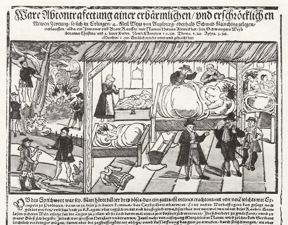 'Die Hinrichtung von Hans Alewekher, Mörder aus Augsburg' ("The Execution of Hans Alewekher murderer from Augsburg", 1589) depicts a family murder in Augsburg. The image on the right depicts the crime scene and should actually be read first. We see Hans' pregnant wife and four of his children, murdered in their sleep. In the same image, the authorities investigate the case. The narrative continues in the left panel, where several events are visualized in one single image. In the lower center, Alewekher is arrested. He is hung from a tree on the top left, while in the top right his corpse is burned at the stake.