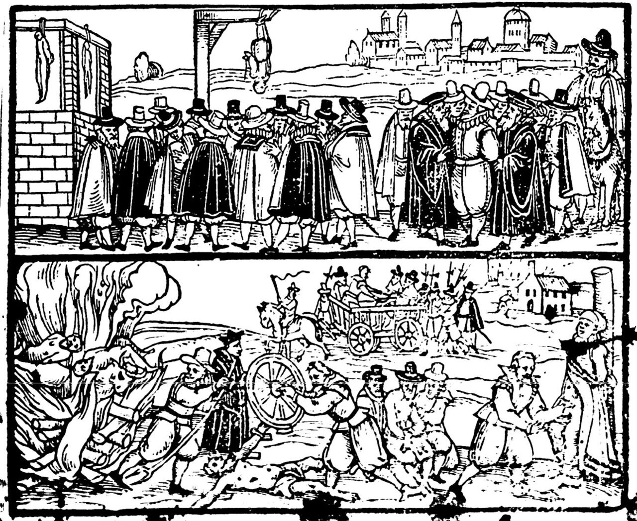 In 1615, Schultes produced another two-panel narrative, 'Zwo Newe und Erschröckliche Zeittungen von Vier Vbelthäteren' ("Two New and Frightening Reports about Four Law Breakers"). The first report deals with a Jewish man, Samuel, who was arrested for theft in Frankfurt am Main. He was originally born in Prague. Since he had committed similar thefts before, he was imprisoned. At first the man wanted to convert to Christianity, but once he was informed about his death sentence, he changed his mind. According to the report, the man originally wanted to die a Jew, but the night before his execution he wanted to convert to Christianity after all. This request was denied, "since he had been untrustworthy before." On 15 April 1615, he was hung upside down at the gallows, until he passed out and died. The top panel shows the execution scene. The second report describes three criminals who were arrested in Mindelheim in Schwaben. They were sentenced for murder, robbery, arson, theft and heresy. The lower panel depicts them being tortured with hot pliers, broken on the wheel and burned at the stake.