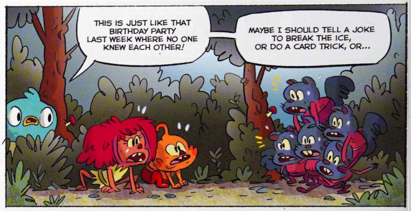 In 2014 and 2015, Schuster illustrated three children's books with the outer space adventures of 'Käpt'n Kaos' by Thomas Klischke for the German publisher Oetinger. His early comics were made for Nickelodeon Magazine, drawing stories based on the 'Harvey Beaks' TV series, about a friendly bird and his two imp friends. Several of these stories were collected in book format by Papercutz. By the time he switched to full time cartooning, Schuster focused on working with his own creations. In addition to children's comics, he has been posting autobiographical cartoons and comic strips on social media, sometimes in the funny animal format, under the title 'Fresh Popcorn Comics'..