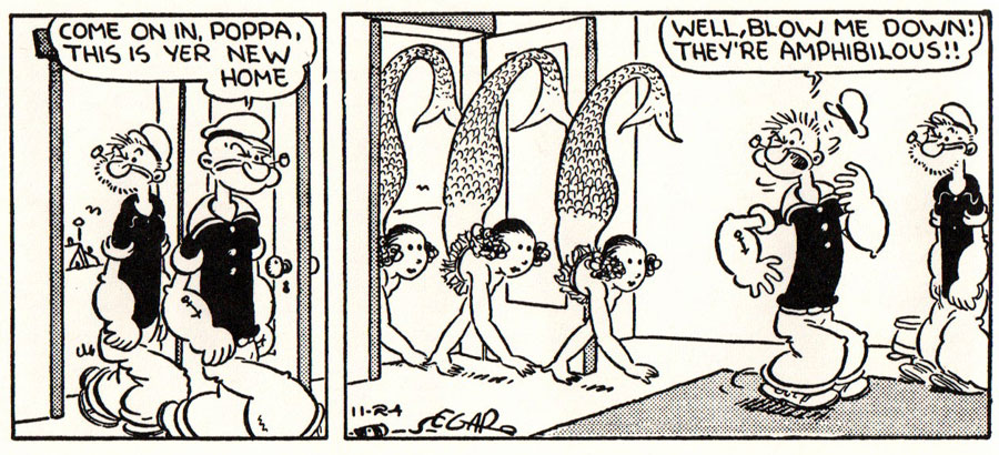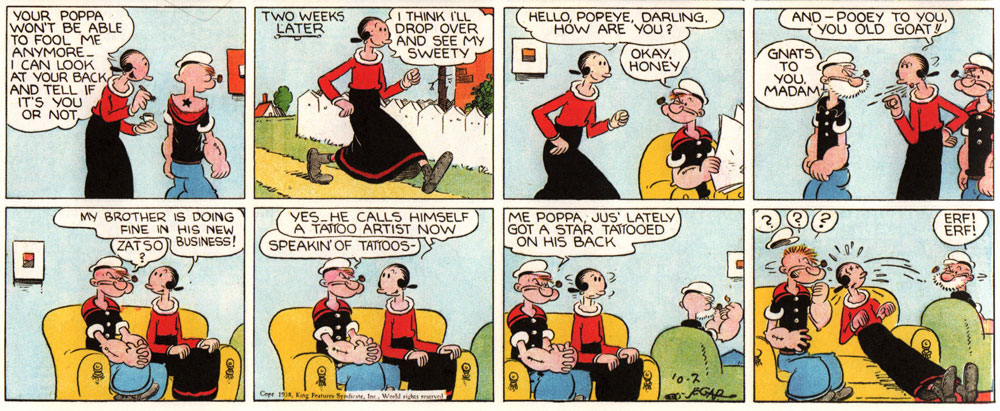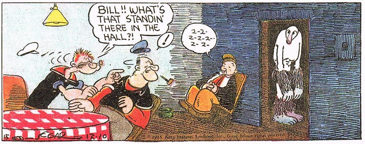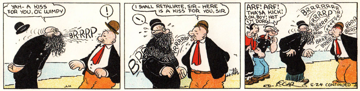 E.C. Segar is one of the few comic pioneers whose signature series is still iconic among general audiences. 'Thimble Theatre' is the fourth longest-running comic series of all time, behind Rudolph Dirks' 'Katzenjammer Kids' (1897-2006), Frank King's 'Gasoline Alley' (1918-   ) and Billy DeBeck's 'Barney Google and Snuffy Smith' (1919-   ). It's third in line as the longest-running uninterrupted newspaper comic series. Of these strips, Popeye is arguably the longest-lasting and had the most global cultural impact. Generations of children have been told to eat their spinach in order to get as strong as Popeye. Millions actually did too. The Allen Canning Company sold spinach with 'Popeye' as their brand name. Wimpy lent his name to fast food chain Wimpy's (1934) and Wimpy's Seafood Restaurant (1938) on Cape Cod, MA. Wimpy was also the nickname of the Vickers Wellington bombers - or "Wimpies". During World War II, the name of the type all-terrain vehicle "jeep" was inspired by Eugene the Jeep. Many marine forces on the Allied side also used Popeye as their mascot. It has sometimes been stated that Segar invented the word "goon"; which isn't true. But he did popularize it in the English language as a way of referring to thugs or brutish cronies. And the word was the direct inspiration for the legendary British comedy team, the Goons. In Japan, the fashion and lifestyle magazines Popeye (1976), Brutus (1980) and Casa Brutus (2000) were all named after Segar's characters. Novelist William Faulkner named a character in his novel 'Sanctuary' (1931) Popeye, and Gene Hackman played a policeman named Popeye Doyle in the classic film 'The French Connection' (1971).