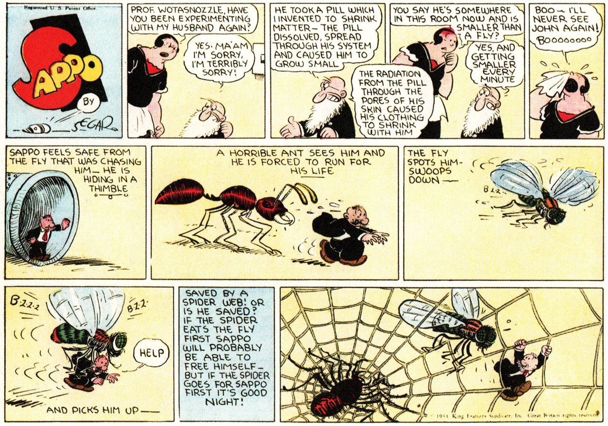 On 8 May 1932, professor O.G. Wotasnozzle (a pun on the U.S. slang word for "big nose": "snozzle") moved in with the Sappos as a boarder. The mad scientist with the long beard invents wacky objects, gadgets, machines and vehicles, which always have bad side effects. Wotasnozzle lifted 'Sappo' to a more entertaining level, but still it never gained the same popularity as 'Popeye'. Which is unfortunate, because some of Segar's most imaginative narratives are found in this underappreciated little gem. Unlike 'Popeye', 'Sappo'  throws all logic out of the window. Storylines continued for months, sometimes years, stapling more unpredictable madness on top of other insanity. In one storyline, Myrtle floats away in the sky, while in another Sappo is shrunk to such a small size that he has to fight viruses. In another unforgettable tale, Wotasnozzle enlarges his brain so he can outsmart his rival, professor Finklestop. In one of the most memorable stories, Sappo's nose grows to such enormous lengths, that it crushes through the panel of the 'Popeye' comic next to it.