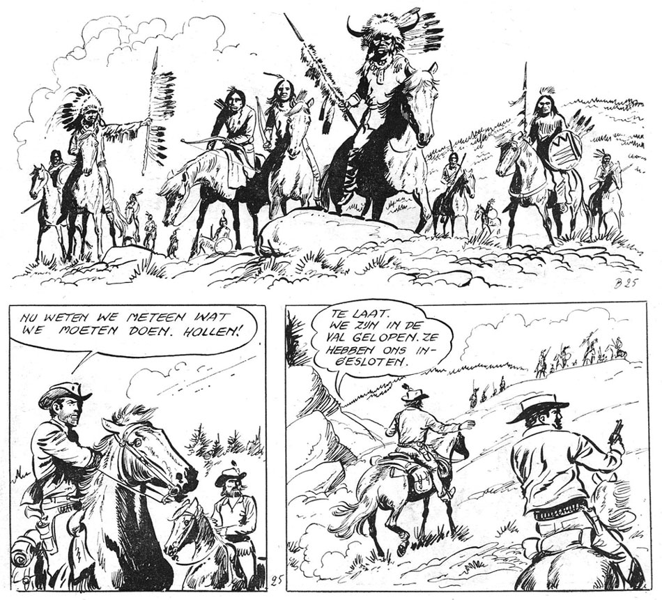 Initially, Sels and Gastmans kept their position at Studio Bessy, so with an additional 14 pages of 'Silberpfeil', they had to produce a total of 42 comic pages each week. 'Silberpfeil' scriptwriter Hugo Renaerts stepped in to pencil an occasional 'Bessy' story too, but it goes without saying that quantity went before quality in this heavy production schedule. Sels and Gastmans had to work day and night to keep up. With their Vandersteen contract terminated in June 1969, they could devote all their time to 'Silberpfeil'. A bi-weekly 'Silberpfeil' magazine was launched by Bastei in June 1970, while the publication in Felix continued as well. By December 1971, Silberpfeil became a weekly magazine, and the serialization in Felix came to an end.