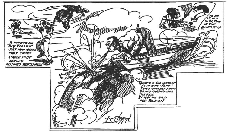 Yet Semon didn't entirely give up the stage yet, since he needed the money. In the late 1900s, he joined the Balbazoo Club, an amateur theatrical organization of the Young Men's Hebrew Association. One of his colleagues there was Ed Wynn, nowadays most famous as Uncle Albert who laughs himself to the ceiling in 'Mary Poppins' (1964). In 1910, Semon moved to New York City, where he asked the way to the nearest newspaper office, which happened to be the headquarters of The Evening Telegram, the evening edition of the New York Telegram. He bought a copy of the paper and read it in his hotel room. Semon noticed that their sports section lacked some good cartoons and thus he went to the newspaper office proposing to make cartoons about this subject. The sports editor instantly asked the young applicant for a sample of his work. Since Semon didn't have any he simply asked if he could have a few minutes to draw a cartoon. His wish was granted and after whipping out a cartoon he was hired. Looking back, Semon estimated he was hired within half an hour, probably the quickest time anyone was ever given a job at a newspaper!