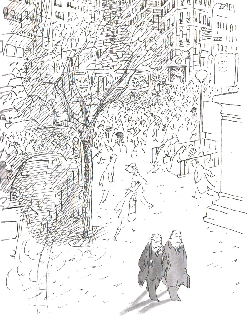 While living in Paris, Sempé spent much time in the Jardin du Luxembourg, observing the people from the surrounding bourgeois neighborhoods. They appear in many of his drawings, strolling casually through life in crowded streets or parks, seen from a bird's eye view. By contrasting the often pretentious dialogue of his miniature characters with imposing surroundings, Sempé playfully puts human behavior into perspective, but his commentary is poetic in nature, and never judging or pushy. Sempé's crowds are filled with diverse and distinctive characters, yet the cartoonist seems to have a preference for little balding men and shapeless females. Rarely drawing from life, Jean-Jacques Sempé's main source of inspiration is his own imagination. Even in old age, he maintained the use of making a drawing every day, although not always meant for publications.