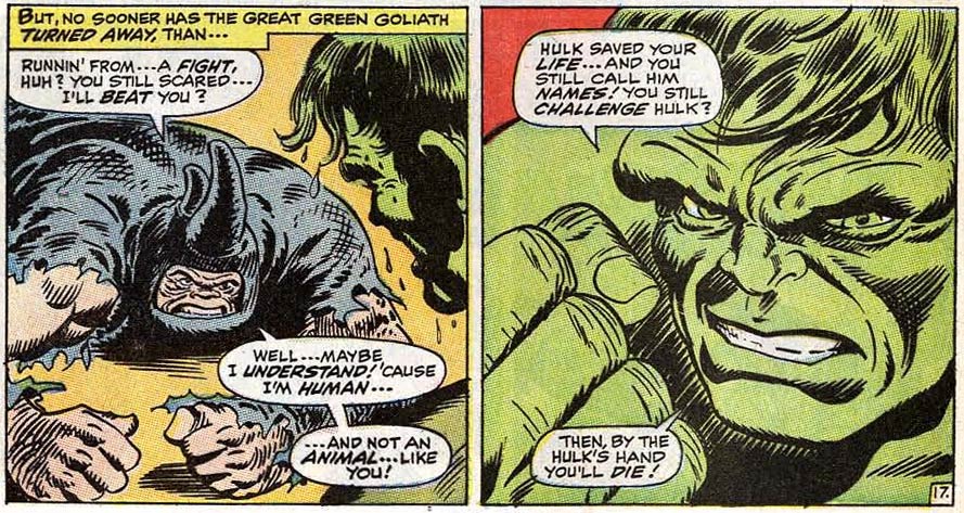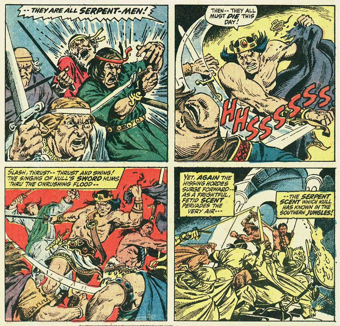 Marie Severin was a regular artist for all 13 issues of 'Not Brand Echh' (1969-1970), the humor comic book in which Marvel parodied its own characters. Severin for instance took care of stories starring 'Spidey-Man', 'Sunk-Mariner' and the 'Simple Surfer', which were often written by Gary Friedrich or Roy Thomas. Between 1971 and 1973, Marie Severin (pencils) regularly worked with her brother (inks) on several issues of 'Kull the Conqueror', based on Robert E. Howard's sword and sorcery barbarian. In 1970 and 1971, she was also the regular cover artist for 'Daredevil'. At this point, she left most of her coloring work to George Roussos.