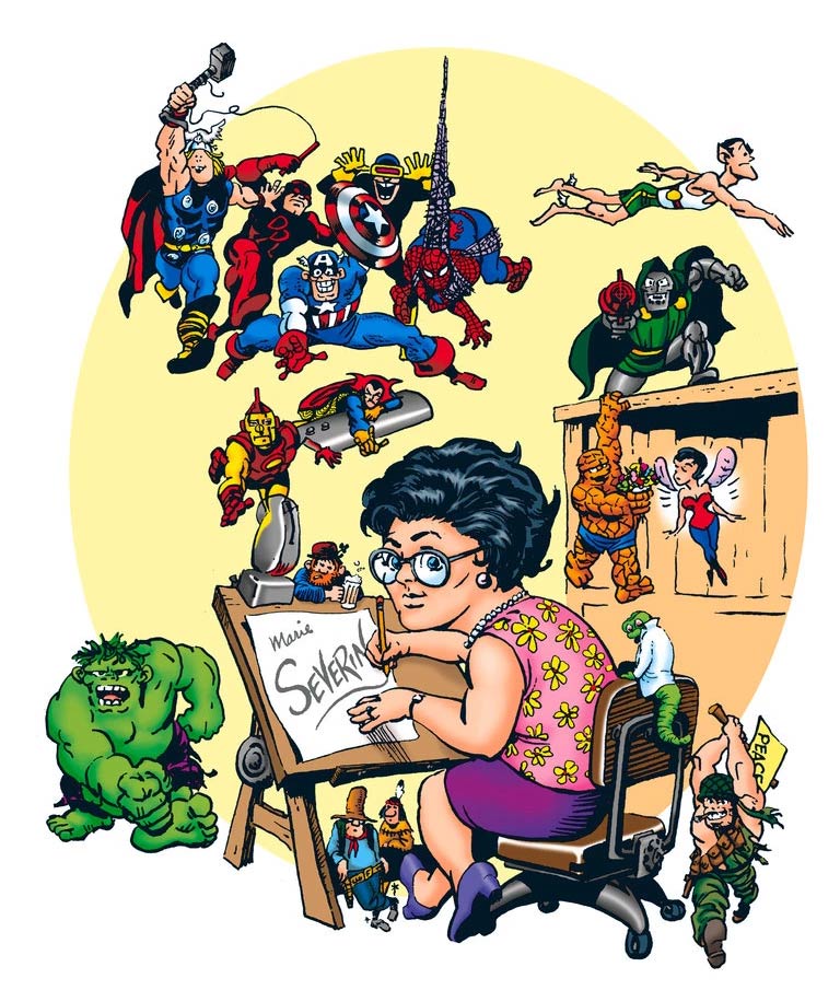 Although her contributions were often overlooked or anonymous, Marie Severin has left a lasting mark on the comic book industry with her production work. She described the colors in comic books as background music, which "gives that little oomph to it." Her talent for drawing expressive and detailed faces was often used for retouching and fill-in work, and also her regular pencil work could be ranked among that of Marvel's top artists, as it showed a great focus on the human aspect and her humor. Because of her unique position within the all-male comic book industry, Severin appeared several times in panels as a spokesperson for the role of women in the comic books. Her outstanding work has earned her numerous awards, starting with the 1971 Shazam Award for Best Penciller for her humor work for Crazy. She later won an Inkpot Award at the San Diego Comic Con in 1988, followed by the Comic-Con International's Icon Award in 2017. Severin was inducted into the Will Eisner Hall of Fame in 2001.