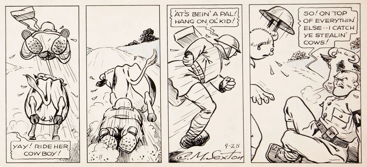 Back in civilian life, Sexton used his World War I experiences as inspiration for his daily newspaper comic strip 'Luke and Duke'. Distributed by King Features Syndicate from 11 June through 10 November 1934, it featured the slapstick adventures of two American soldiers (nicknamed "doughboys") during the Great War. The strip was however short-lived, and remained Sexton's only excursion into comics. In topics and style, Sexton's strip was similar in content to Bill Mauldin's later 'Willie and Joe' World War II comics (1940-1948).