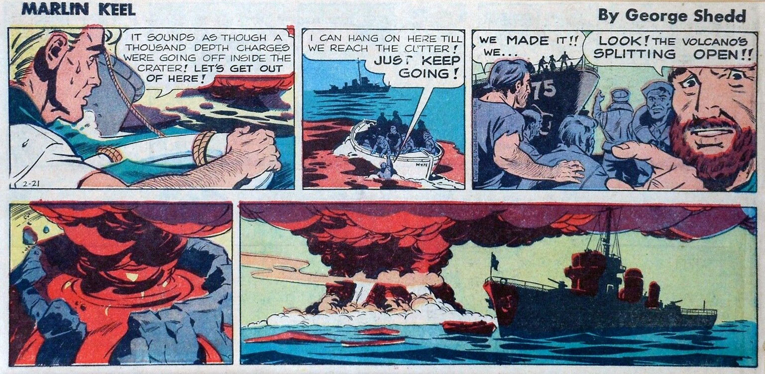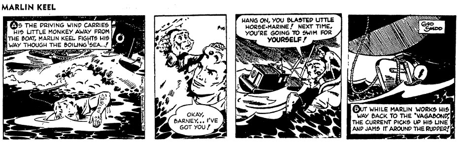 Between 14 September 1953 and 21 November 1954, George Shedd had his own newspaper comic 'Marlin Keel', syndicated by the Post-Hall Syndicate. The realistically-drawn stories feature the adventures of skipper Marlin Keel, who traveled the seas in a fishing boat named Vagabond, accompanied by his pet monkey Barney. In the creation of his comic, Shedd received advice from Ed Dodd, the creator of 'Mark Trail', who may have worked on the feature as a writer. Much like the 'Mark Trail' strip, Shedd's 'Marlin Keel' was a straightforward daily adventure series, with the Sunday page dedicated to an educational corner about wildlife. Originally, Shedd drew 'Marlin Keel' mostly on his own, although later in its run he worked with assistants like Bob Bolling and Alvin C. Hollingsworth. Although some adventures were published in book format by Atlas, the 'Marlin Keel' comic never caught on, so the title character eventually went ashore again. The series debuted on the same day as another nautical comic, Keats Petree's 'Nick Haliday' (1953-1956), which enjoyed a longer run in the papers.