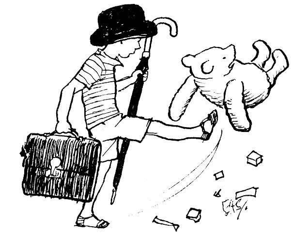 In Shepard's case, he wasn't pleased with his status as the "Winnie-the-Pooh artist". His nearly 50-year long career with the oldest and foremost British satirical magazine Punch was almost forgotten. Any other children's book he illustrated barely received the same attention. But while Milne and Christopher Robin could at least disassociate themselves from Winnie-the-Pooh, Shepard didn't have that luxury. For the rest of his career, he was forced to keep drawing and selling Pooh-related artwork, just to bring in money. Even at age 93, Shepard colorized all his original 240 black-and-white illustrations with water colors in less than four months' time! Understandably, he sometimes got sick of the characters. One time he made an illustration for Punch where Christopher Robin shockingly kicks Winnie away.