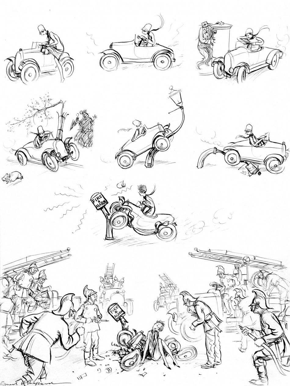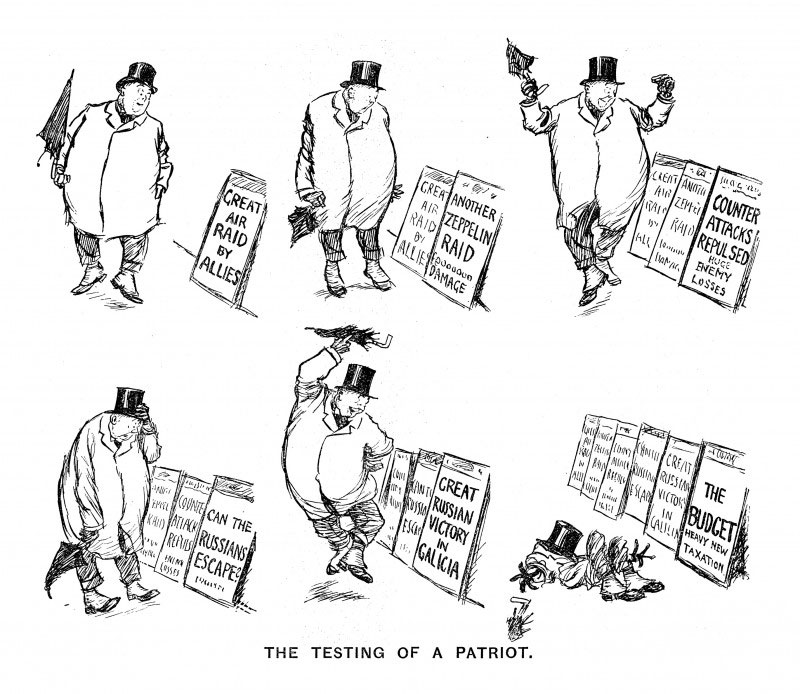 While most of Shepard's work for Punch consists of one-panel cartoons, he occasionally drew some multi-panel sequential gags. Most are presented in pantomime. 'The Testing of a Patriot' (1915), for instance, shows how the average citizen is delighted with the military victories of the national army. His concerns and enthusiasm are depicted in several successive panels. However, in the final image, he melts down when a "heavy new taxation" to pay for the military costs is announced. 'A Venetian Glass-Blower's Tragedy' (date unknown) shows how a Venetian glass-blower takes tremendous care at making a Venetian glass, only for an over-enthusiastic lady to grab the object and accidentally crush it in her arms. Another comic mocking women is 'Beginner's Luck' (1928), in which a young female driver gushes over the road, eventually crashing into a fire alarm, summoning all the firemen in the vicinity to the place of accident.