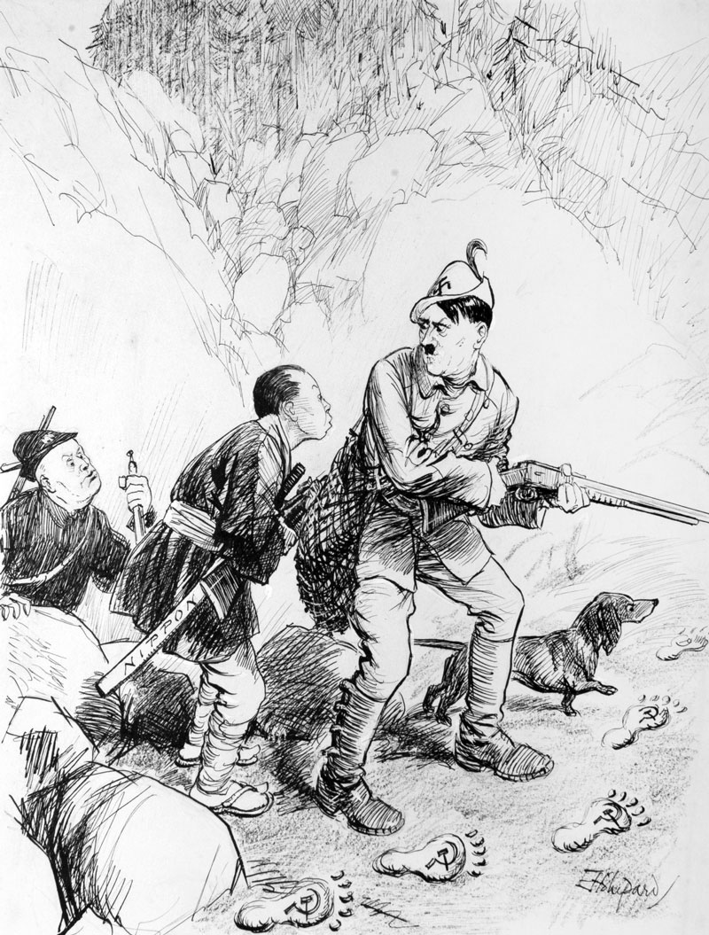 'Hunting the Bug Bear', political cartoon by E. H. Shepard (Punch, 25 November 1936). Benito Mussolini, a Japanese man and Adolf Hitler go hunting after Soviet Russia.
