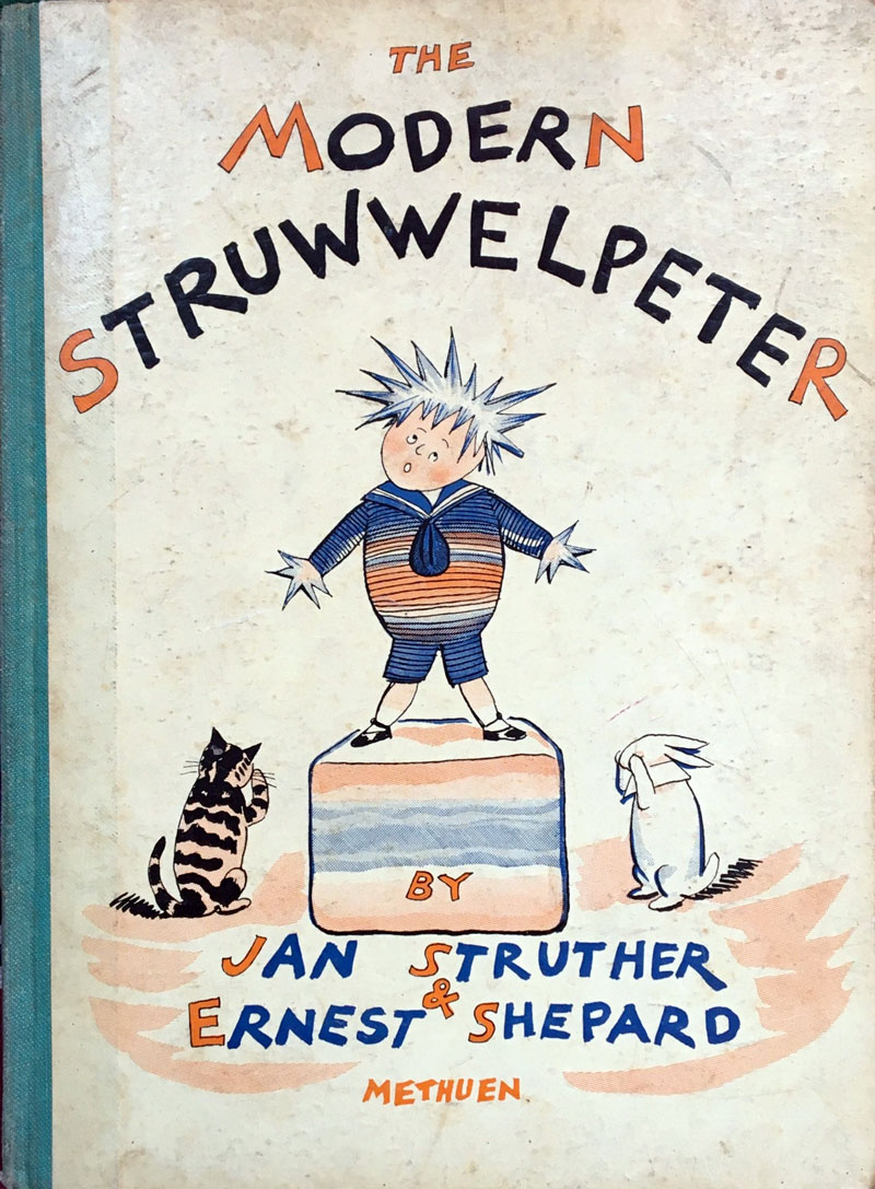 In 1935, Jan Struther (pseudonym of Joyce Maxton Graham, author of 'Mrs. Miniver') wrote a parody of Heinrich Hoffmann's infamous 19th-century children's book 'Der Struwwelpeter'. Hoffmann's original featured cautionary tales set to rhyme, usually with disobedient children dying horrific deaths. Struther's version, 'The Modern Struwwelpeter', isn't a direct parody, but a pastiche. It features modernized "scare 'em straight" stories, but with a witty, satirical undertone. Struther's 'Modern Struwwelpeter' was first serialized in Punch, with black-and-white illustrations by E. H. Shepard. In 1936, the stories were colorized and released in book format by Long Meadow, Guildford.