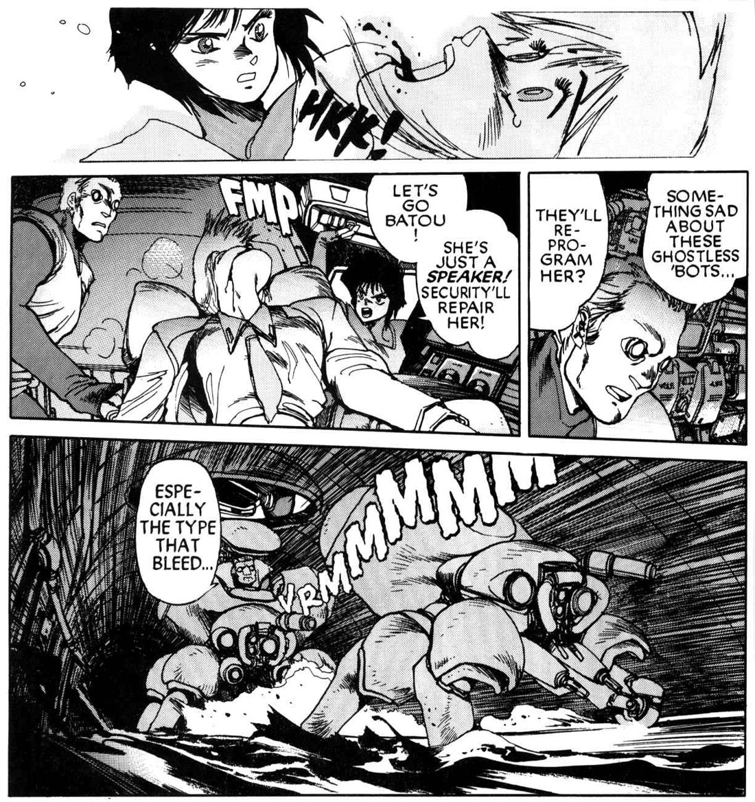 Shirow is notorious for drawing every little technical detail of machines, vehicles, guns and buildings in his comics. Apart from the obsessive attention he spends to his illustrations, he also multi-layers his plot lines with philosophical questions and untranslatable puns. In his early years, he sometimes threw out entire panels and pages - inked and all - if he wasn't satisfied with them. This approach naturally slows down his overall productivity. At the same time, it also allows him to maintain creative as well as quality control. A quiet and humble man, he enjoys painting, making pen shafts and grip handles and reading books about robots and insects.