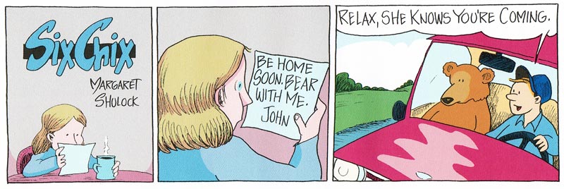 Margaret Shulock started her career in the medical industry, long before she ever thought about cartooning. She quit her work to run a small farm in South Western New York together with her husband. Shulock started drawing postcards and made a cartoon calendar in 1996, which drew the attention of a cartoonist. She sent some of her work to King Features and was immediately accepted as one of the female comic artists on the newspaper strip 'Six Chix'.