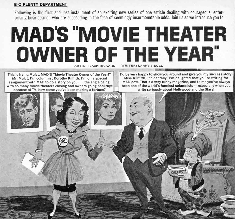 'Mad's Movie Theater Owner of the Year' (Mad #76, January 1963, art by Jack Rickard). The columnist Dorothy Killfith is a caricature of real-life columnist Dorothy Kilgallen.