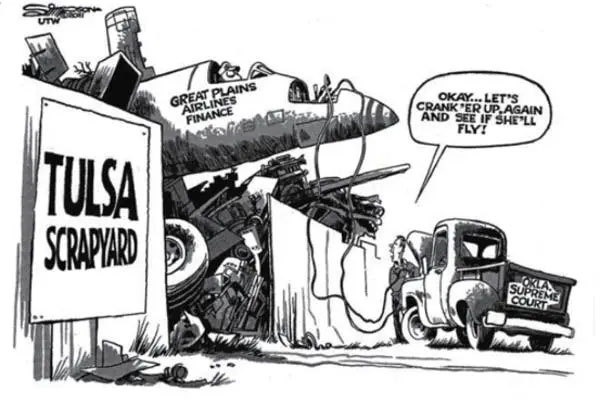 On 20 October 2011, Simpson submitted a cartoon about the Oklahoma Supreme Court trying to finance The Great Plains Airlines. It depicted a judge trying to lift up a rusty old plane with his pick-up truck. However, the image was ripped off from a late 1970s cartoon by Jeff MacNelly, referring to U.S. President Jimmy Carter's preference to buy B-52 planes for the U.S. military. To make matters worse, it wasn't even the first time that Simpson ripped off this particular cartoon. As early as 1986, while still a cartoonist for The Tulsa Tribune, he had plagiarized the image, only in reference to a controversy over American Airlines. However, back then his theft had remained unnoticed. This time he wasn't so lucky. On 25 October 2011, Simpson's plagiarism was uncovered. Five days later, Alan Gardner posted another example of Simpson plagiarizing Jeff MacNelly on his website dailycartoonist.com. The cartoon in question shows a Congressman comforting a soldier next to a haunted house with the name "Bosnia" that Congress will be "right behind you". Simpson copied the entire image, only changing it in the context of the Oklahoma Water Resources Board telling a woman to visit the "Bates Motel" (from the horror movie 'Psycho') and "enjoy our water plan".