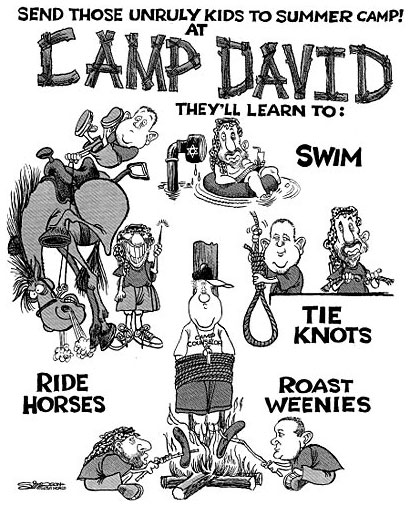 'Camp David', cartoon by Dave Simpson, depicting Israeli Prime Minister Ehud Barak, PLO leader Yasser Arafat and U.S. President Bill Clinton.