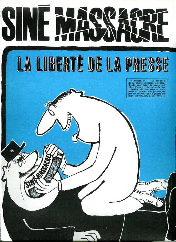 In May 1968, Siné co-founded the satirical magazine L'Enragé with Jean-Jacques Pauvert and cartoonists like Georges Wolinski, while also contributing to Action. He had his own section in Charlie Hebdo, called 'Siné Sème Sa Zone', from 1981. Since 1999, he wrote and illustrated a series of books about his life and work, titled 'Ma Vie, Mon Oeuvre, Mon Cul!' ('My Life, My Work, My Ass!'). Siné also appeared in Benoît Lamy's documentary 'Cartoon Circus' (1972), a Belgian documentary about cartoons and comics, in which he was interviewed alongside Picha, Roland Topor, Cabu, Jean-Marc Reiser, François Cavanna, Professeur Choron, Gal (Gerard Alsteens), Georges Wolinski, Willem, Joke and Jules Feiffer.