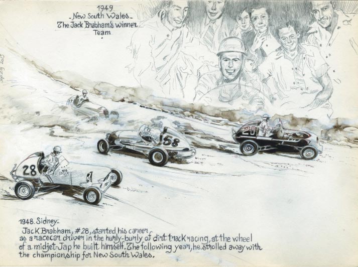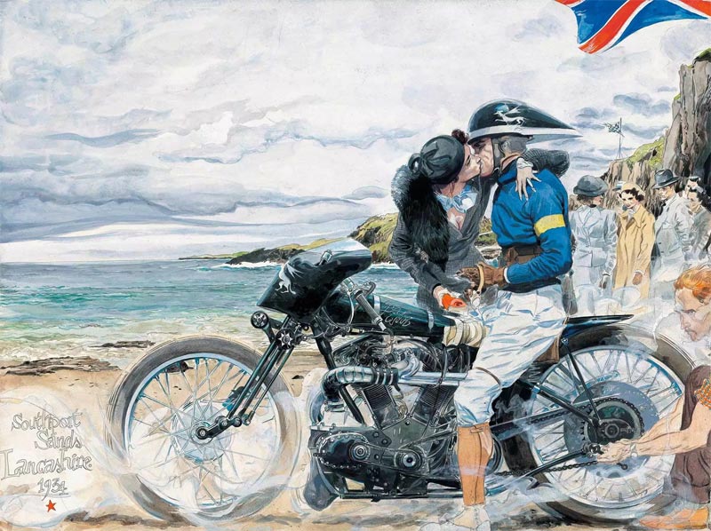 Throughout his career, the man produced a great many illustrations and paintings with retro-style motorcycles, race cars and pin-ups. They were not only exhibited in galleries, but also published in limited edition art books like 'Best of Racing' (Art Moderne, 1987) and 'Poupées de Sire' (Zanpano éditions, 2010-2011). He was an illustrator for the specialized magazine Moto Revue Classic, and made illustrated documentaries about race tracks with author William Pac, collected in the book 'Racing 1950-1970: Monaco, Le Mans, Indianapolis' (Éditions La Sirène, 1986). With Jean-Marc Thévenet, he visualized the lives of classic racecar drivers in the book '12 Pilotes' (2014) for Dupuis' Aire Libre collection. Denis Sire designed the official poster for the historic Circuit des Remparts in Angoulême in 2005, and visualized 24 historical scenes from the 24 Hours of Le Mans in 24 paintings for the third edition of Le Mans Classic in 2006.