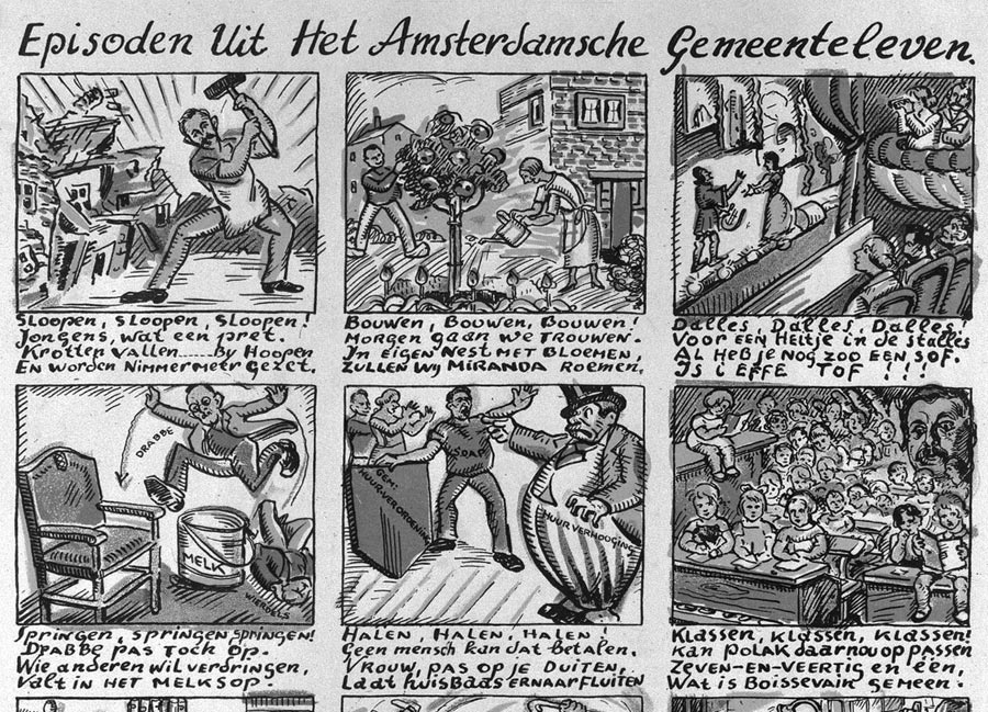 Fragment of a picture story about Amsterdam politics from 1927, dealing with the building of new laborer's houses under direction of alderman Floor Wibaut, among other things.