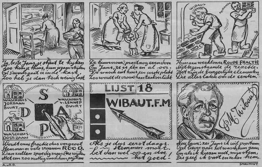 'De wasch in 't Huisgezin van Jans, Voorheen en Thans' (fragment of another picture story, starring social-democratic Amsterdam aldermen Floor Wibaut and Monne de Miranda (around 1930).