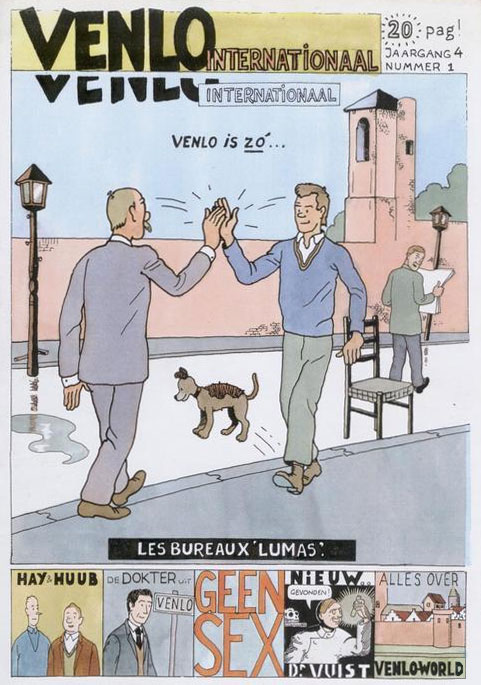 The magazine Venlo-Internationaal quickly gained a cult status for its absurdism and utter lack of logic. Luuk was forced to continue on his own after Mark Smeets' death in 1999. By then, two issues had appeared under the imprint Les Bureaux Lumas Publications. Afterwards, new installments of Venlo-Internationaal were released on an irregular basis. Each volume is filled with made-up stories, jokes and letters. Luuk Smeets applies the same nonsensical approach as his brother, albeit in a more naive drawing style. Like his brother however, Luuk's artwork reveals Hergé's 'Tintin' as a main source of inspiration.