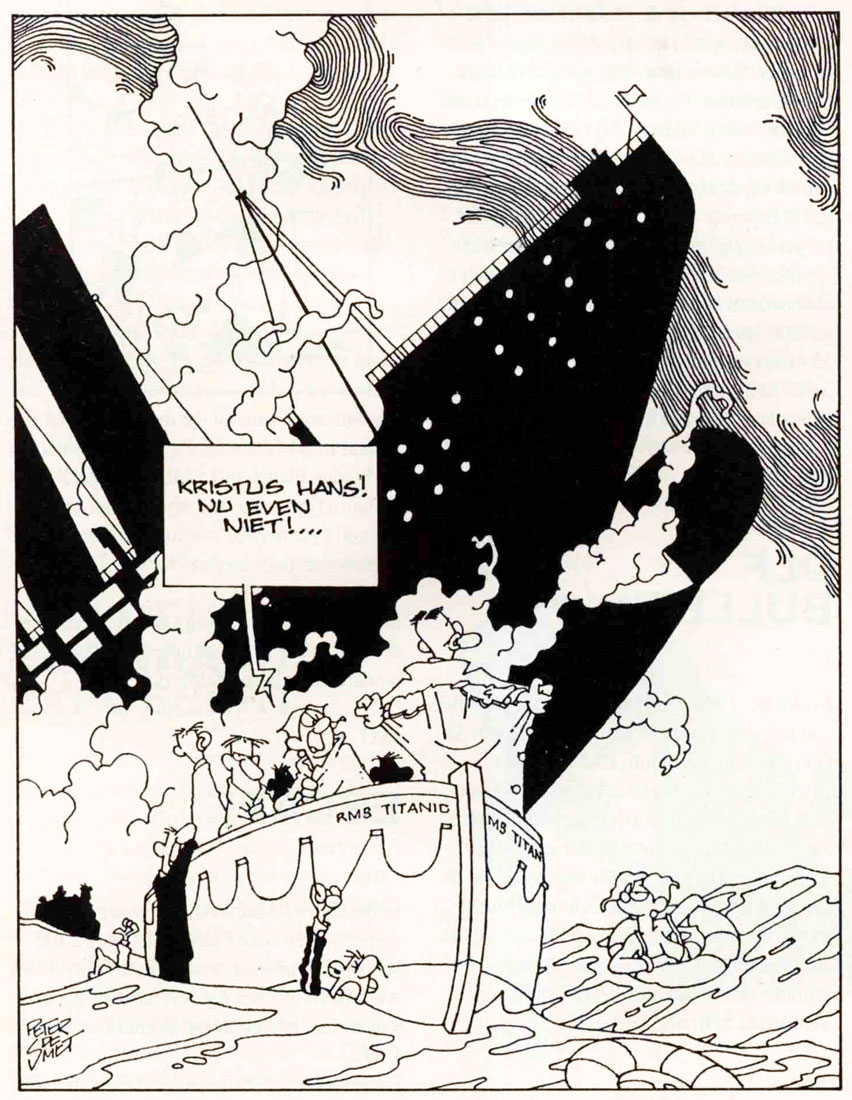 In 1984, Peter de Smet was one of the founders of a new comic magazine called Titanic, together with Frits van der Heide and Renée van Breukelen. It was the first mainstream comic magazine in the Netherlands aimed at an adult audience, initially published by Comic Design. Although it appeared from 1984 to 1989, De Smet only served as editor during its first year. Titanic suffered from poor sales from the start, and the original team was quickly replaced by Peter de Raaf and Hans van den Boom, who also became the publisher. Consequently, only the early issues of Titanic contained work by De Smet. Besides new stories with 'De Generaal', he contributed yet another guerrilla strip, called 'De Bevrijders' (1984). De Smet also returned in the final issue with a farewell drawing featuring Titanic's historical namesake.